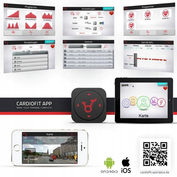 - Ergometr oferuje również możliwość sterowania wszystkimi funkcjami poprzez aplikację Cardiofit na Androida (od wersji 4.3) i iOS (od 4S, od 7.1).