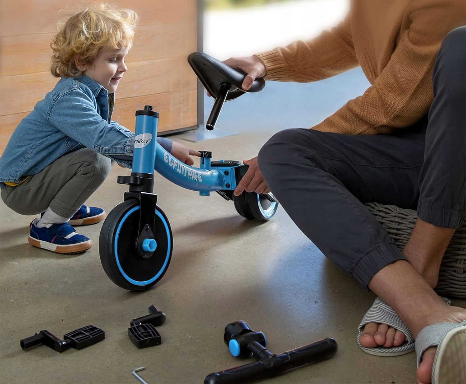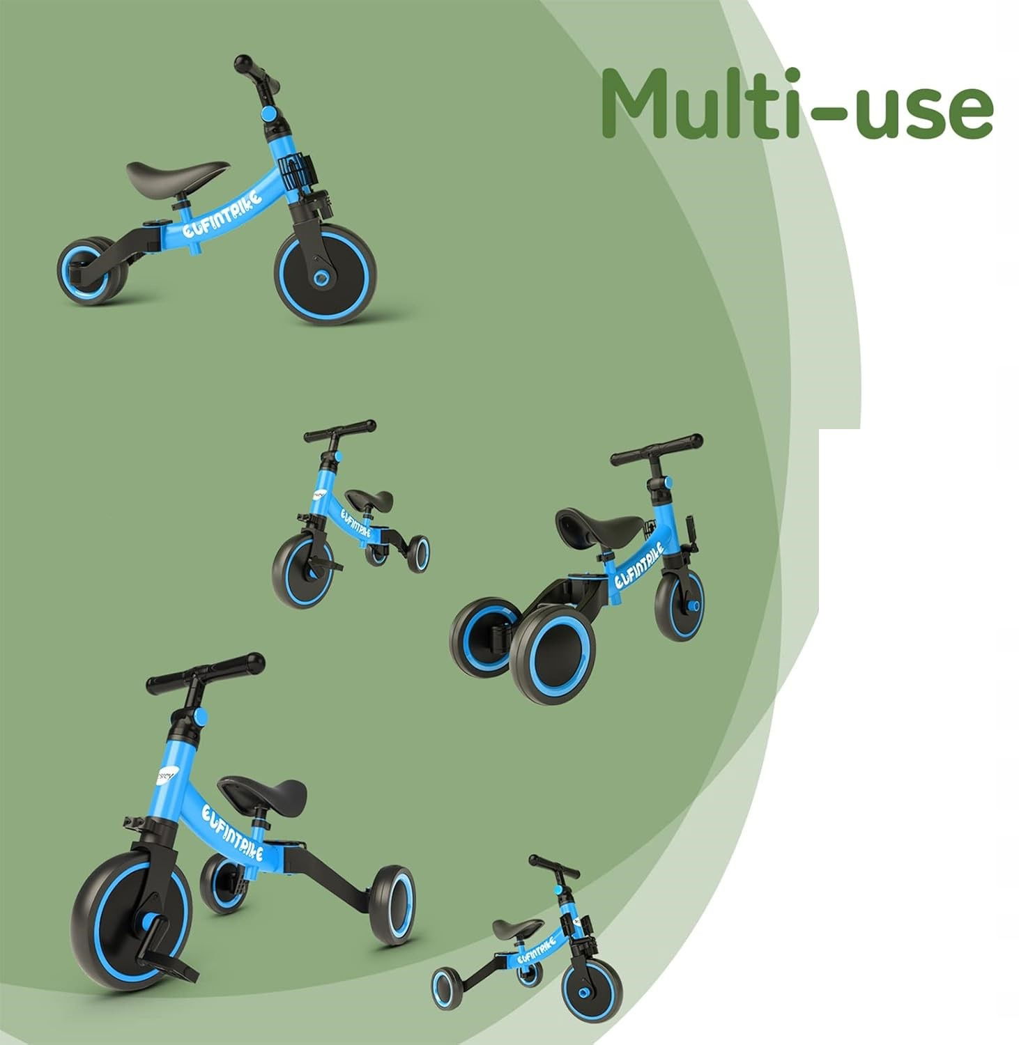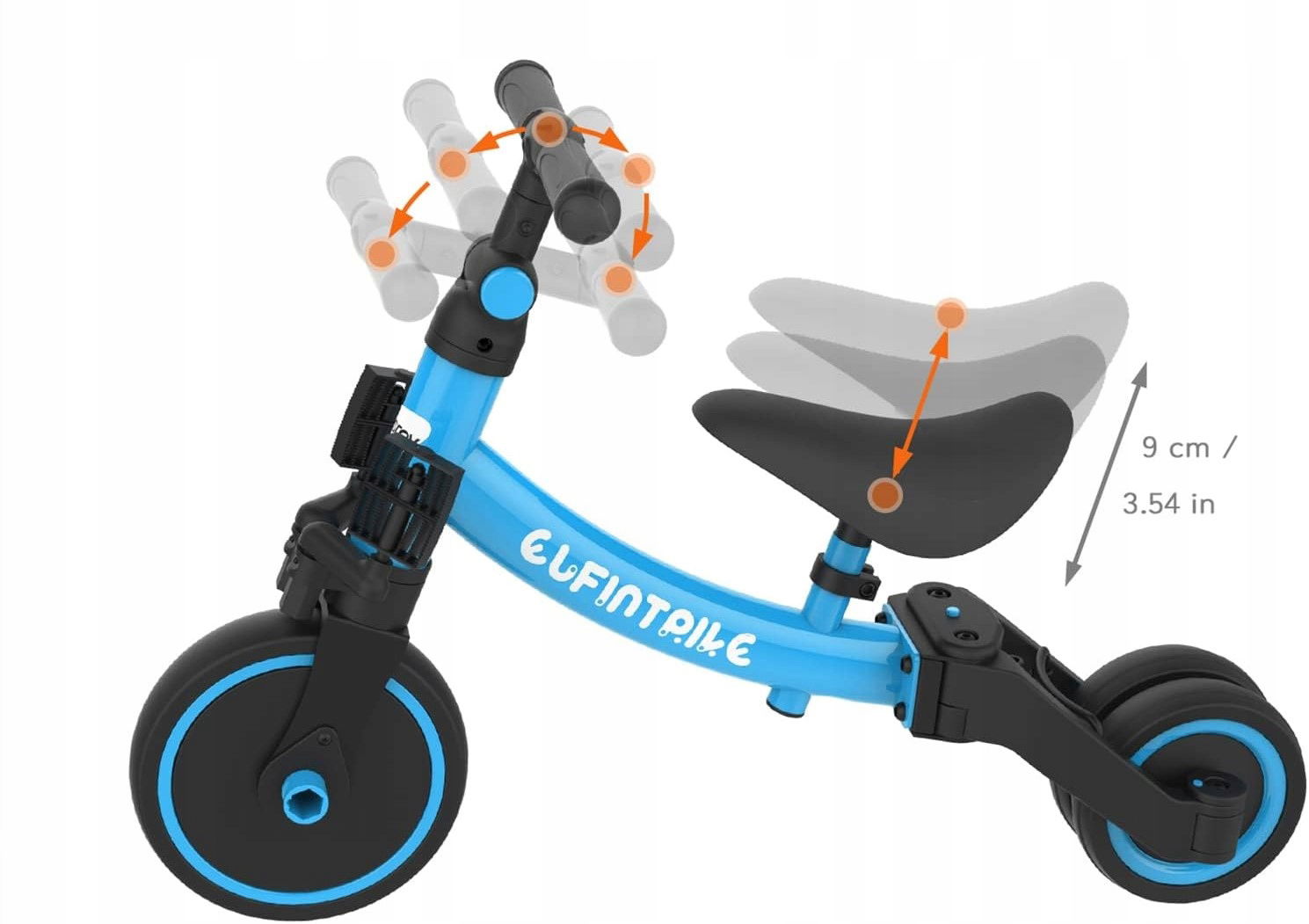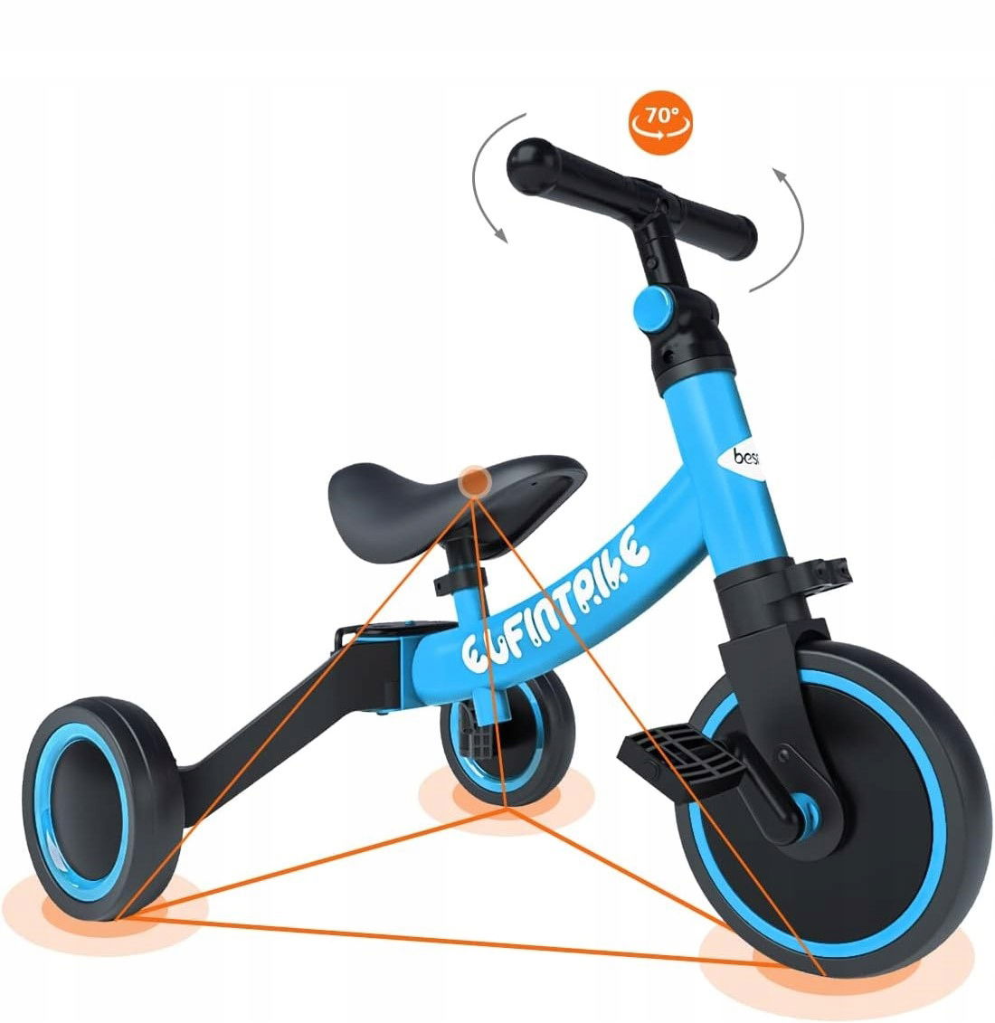 ✅ 5 trybów użytkowania: Rowerek może być używany jako trójkołowy (duży/mały kąt), poślizgowy oraz jako pomoc w nauce chodzenia (duży/mały kąt).