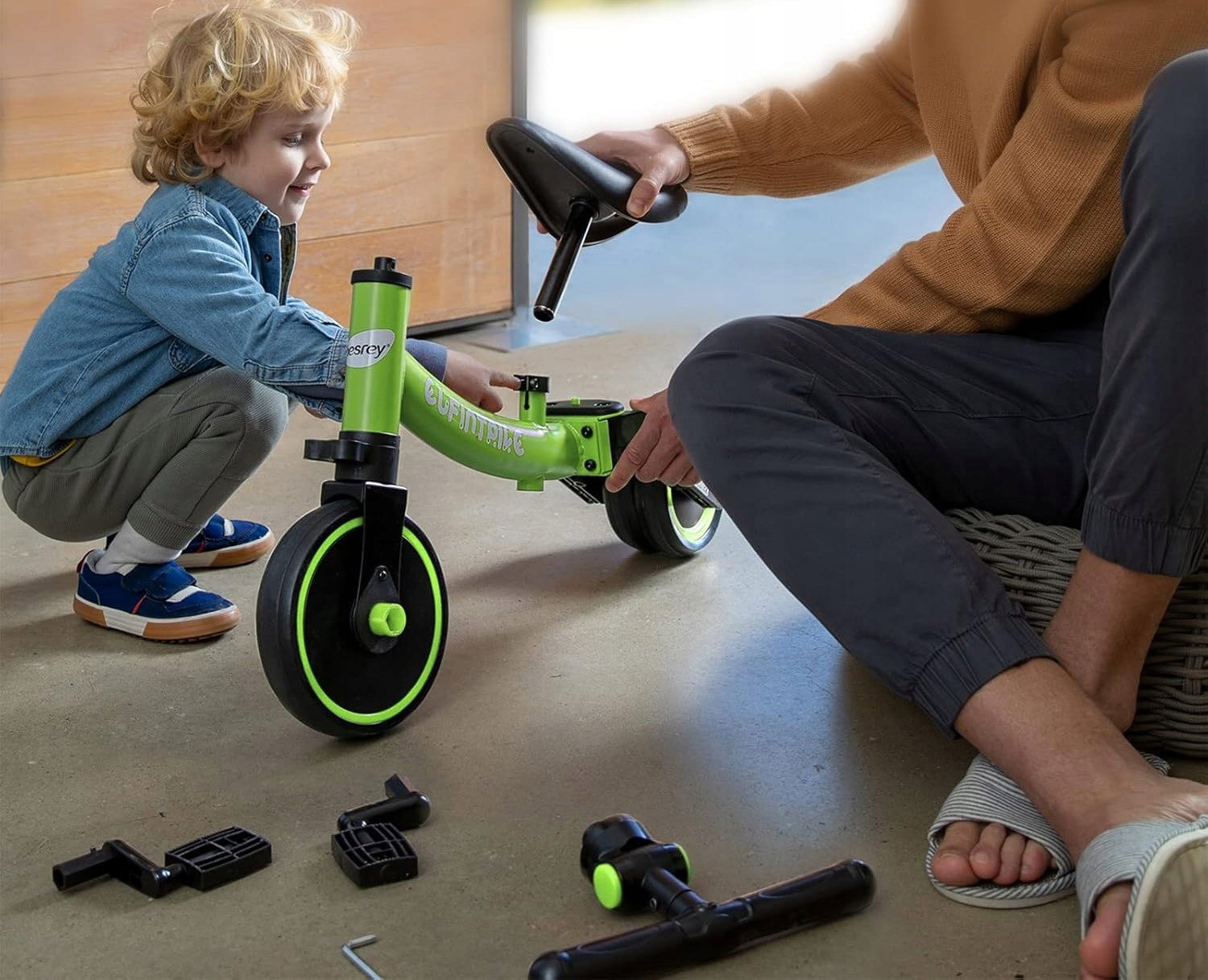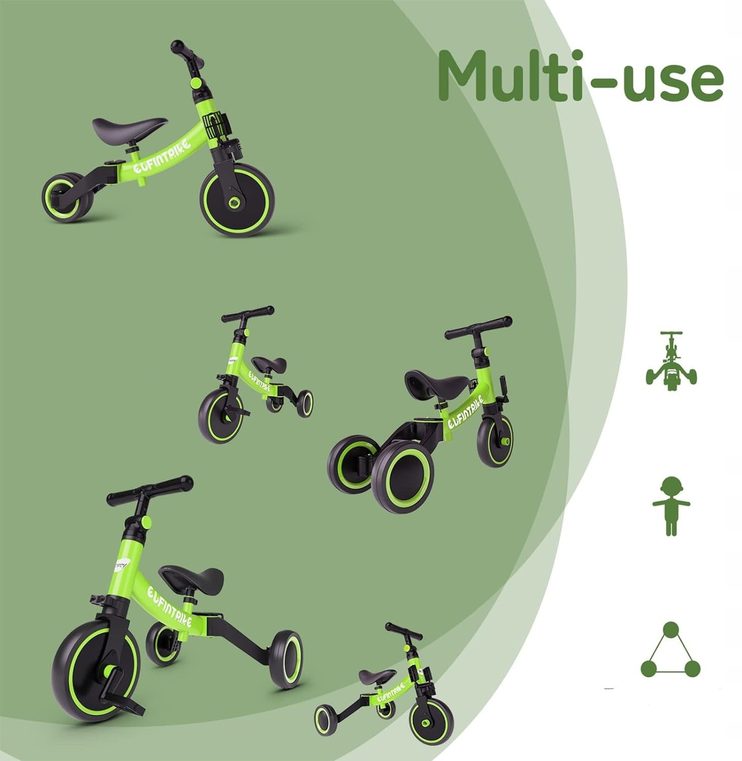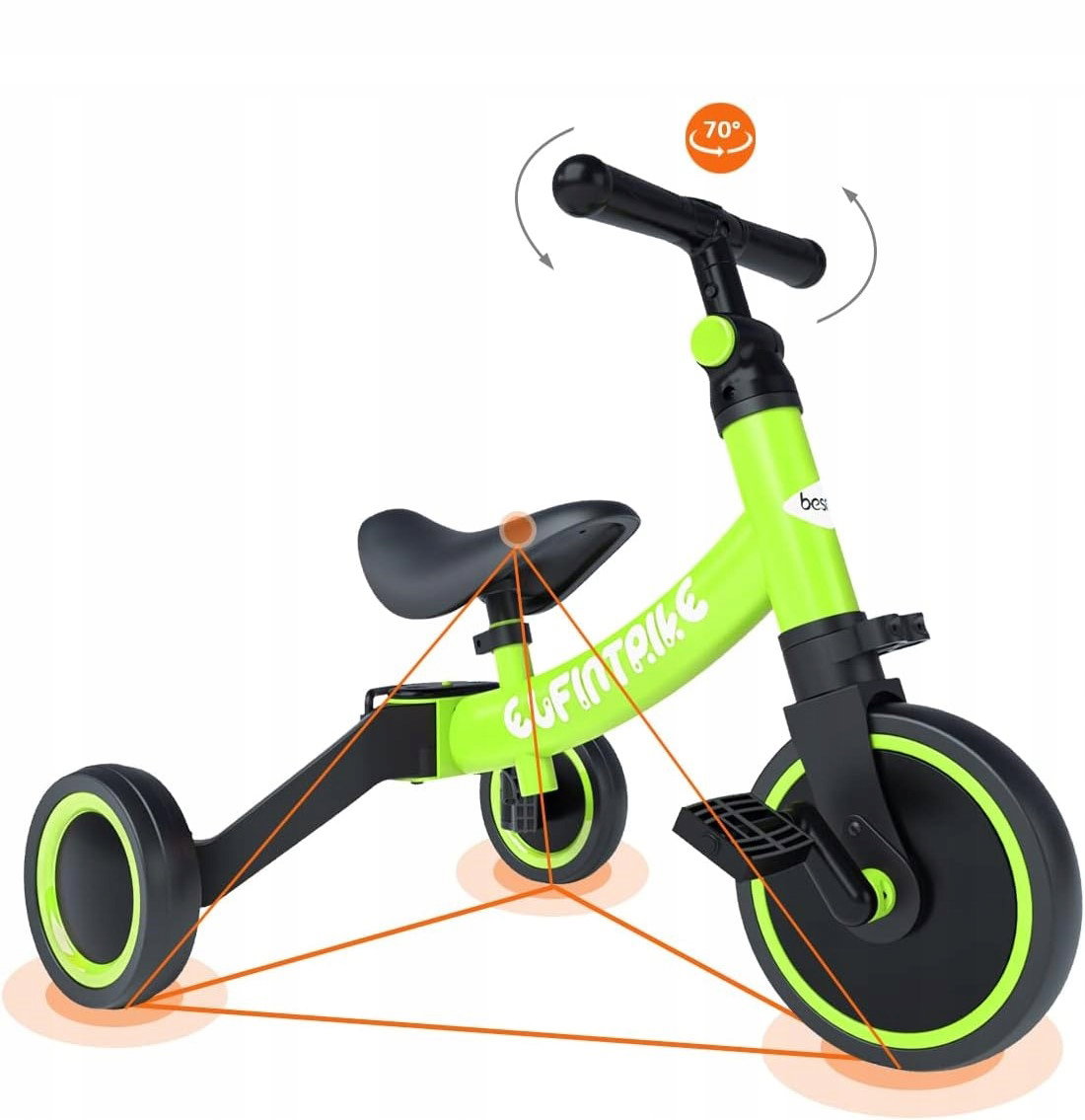 ✅ 5 trybów użytkowania: Rowerek może być używany jako trójkołowy (duży/mały kąt), poślizgowy oraz jako pomoc w nauce chodzenia (duży/mały kąt).