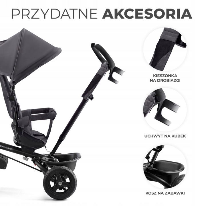 Akcesoria: torba na drobiazgi, 2 kosze - duży za siedziskiem i mały przy kierownicy, uchwyt na kubek, dzwonek