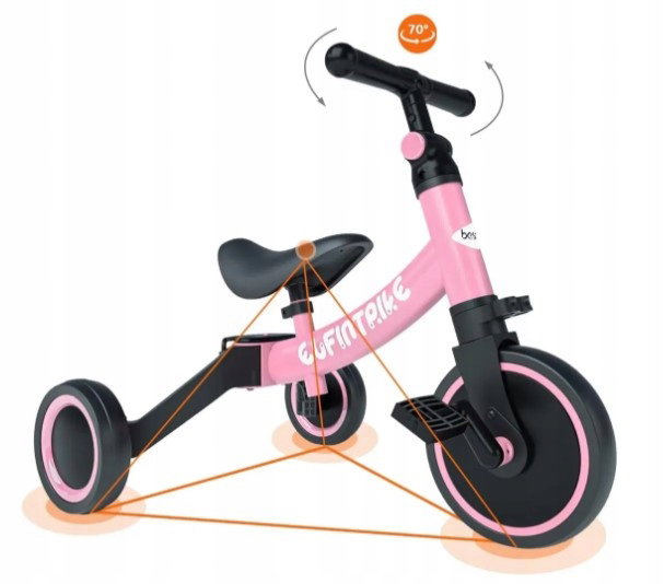 Ten różowy rowerek besrey to prawdziwy kameleon wśród dziecięcych pojazdów. Zaprojektowany z myślą o maluchach od 1. do 4. roku życia, oferuje 5 różnych trybów, które dostosowują się do zmieniających się potrzeb i umiejętności dziecka. Od stabilnego trójkołowca (w dwóch konfiguracjach kątowych), przez tryb poślizgowy, aż po pomocnika do nauki chodzenia – ten jeździk wspiera rozwój równowagi i koordynacji.