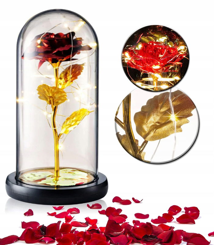Magiczna róża w szklanej kopule – symbol wiecznej miłości Wprowadź odrobinę baśniowego uroku do swojego wnętrza dzięki eleganckiej róży zamkniętej w szklanej kopule – inspirowanej klasyczną opowieścią „Piękna i Bestia”. To niezwykle romantyczna dekoracja, która nie tylko przyciąga wzrok, ale również niesie głębokie przesłanie: prawdziwa miłość jest wieczna, odporna na czas i przeciwności losu. Każdy detal tej kompozycji został starannie dopracowany, by oddać piękno natury w niezwykle subtelnej, niemal magicznej formie.