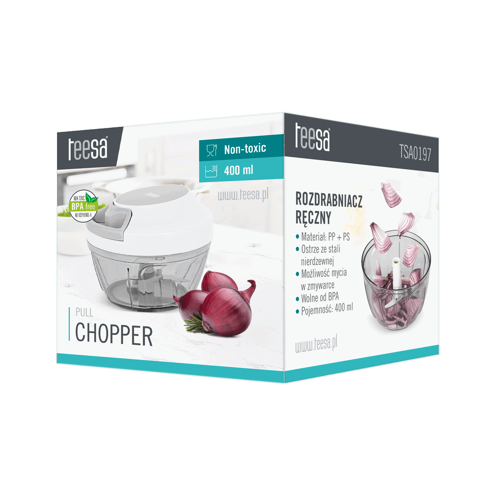 Potrzebujesz małego urządzenia, które pomoże Ci szybko przygotować ulubioną sałatkę albo pastę jajeczną? A może wybierasz się na biwak i potrzebny Ci siekacz do cebuli? Wybierz ręczny mini rozdrabniacz do warzyw Teesa o pojemności 400 ml, który wykorzystując trzy, rozmieszczone na różnych poziomach ostrza z łatwością rozdrobni cebulę, marchew, orzechy czy zioła.