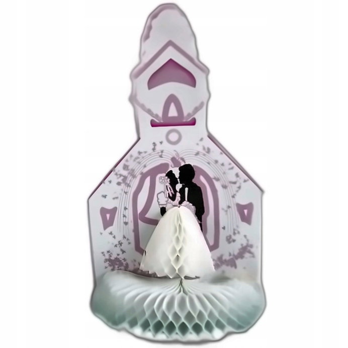 Efektowna rozetka z motywem Pary Młodej w kościele, idealna jako dekoracja na wesele lub ślub. Wymiary 17x29 cm, zapakowana w ochronne opakowanie. Wysokiej jakości materiał sprawia, że jest trwałym i stylowym elementem dekoracyjnym.