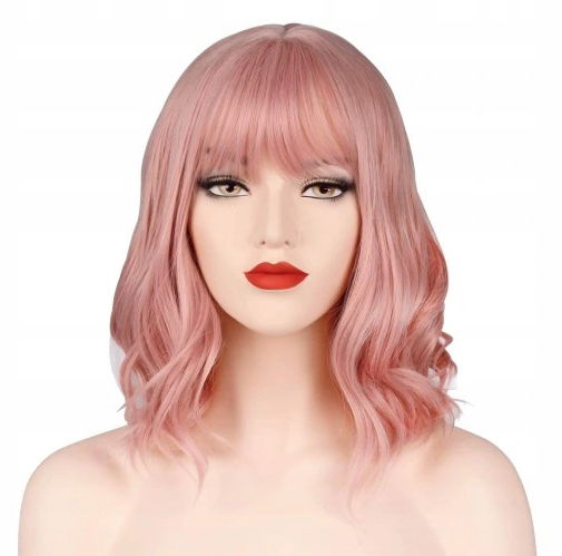 RÓŻOWA PERUKA PÓŁDŁUGA Z GRZYWKĄ PODKRĘCONE KOŃCE