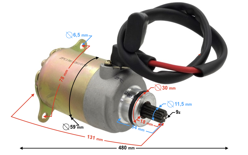Rozstaw otworów mocujących: 78,5 mm. Średnica otworów:6,5 mm. Średnica rozrusznika : 59 mm. Średnica wałka: 11,5 mm. Długość wałka: 18 mm. Ilość zębów: 9. Długość całkowita: 132 mm.
