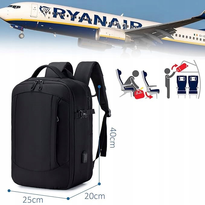 - Wymiary plecaka: 40 x 20 x 25 cm, co odpowiada maksymalnym wymaganiom bagażu podręcznego dla linii lotniczych takich jak Ryanair.
