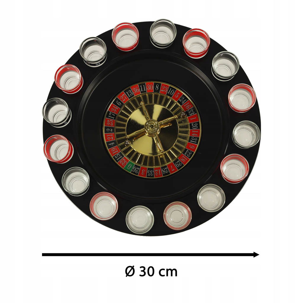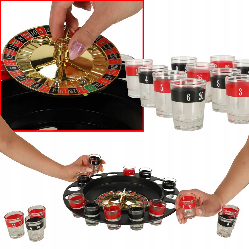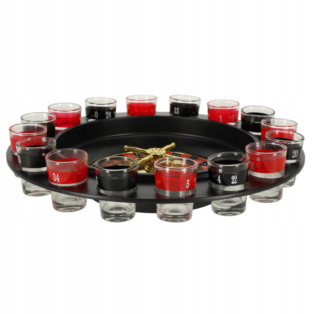 Imprezowa ruletka to pewny sposób na rozkręcenie każdej imprezy. Wystarczy napełnić 16 znajdujących się w zestawie kieliszków dowolnym napojem (najlepiej alkoholowym), zakręcić kołem i wrzucić na nie kulkę - wszystko dzieje się jak w prawdziwej ruletce, tyle że im częściej wygrywasz, tym szybciej odejdziesz od stołu.