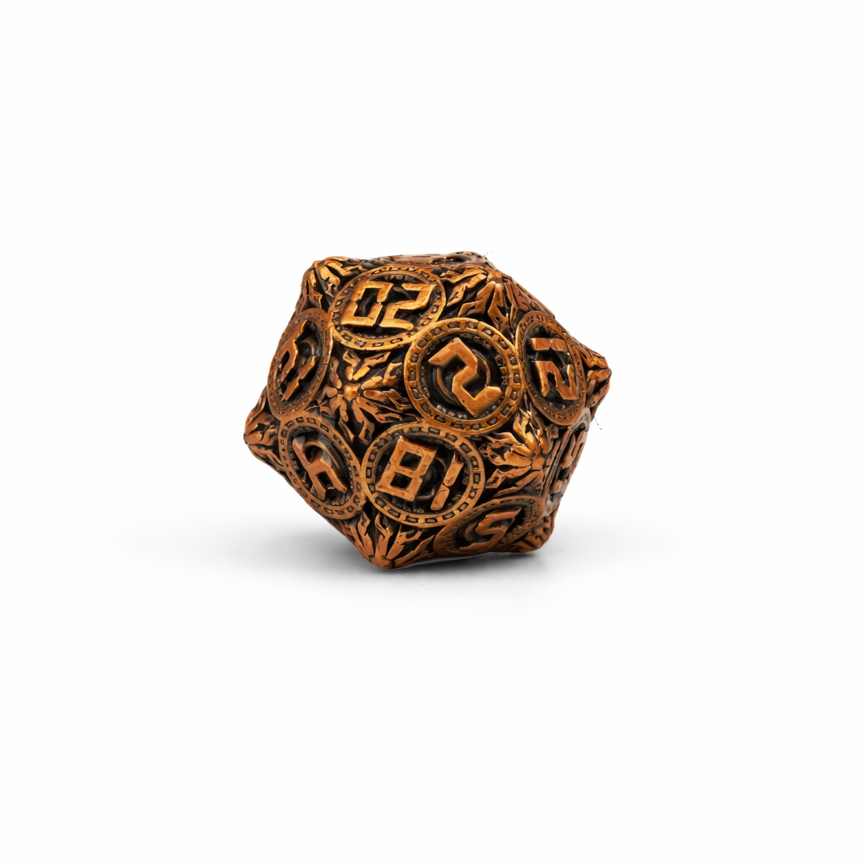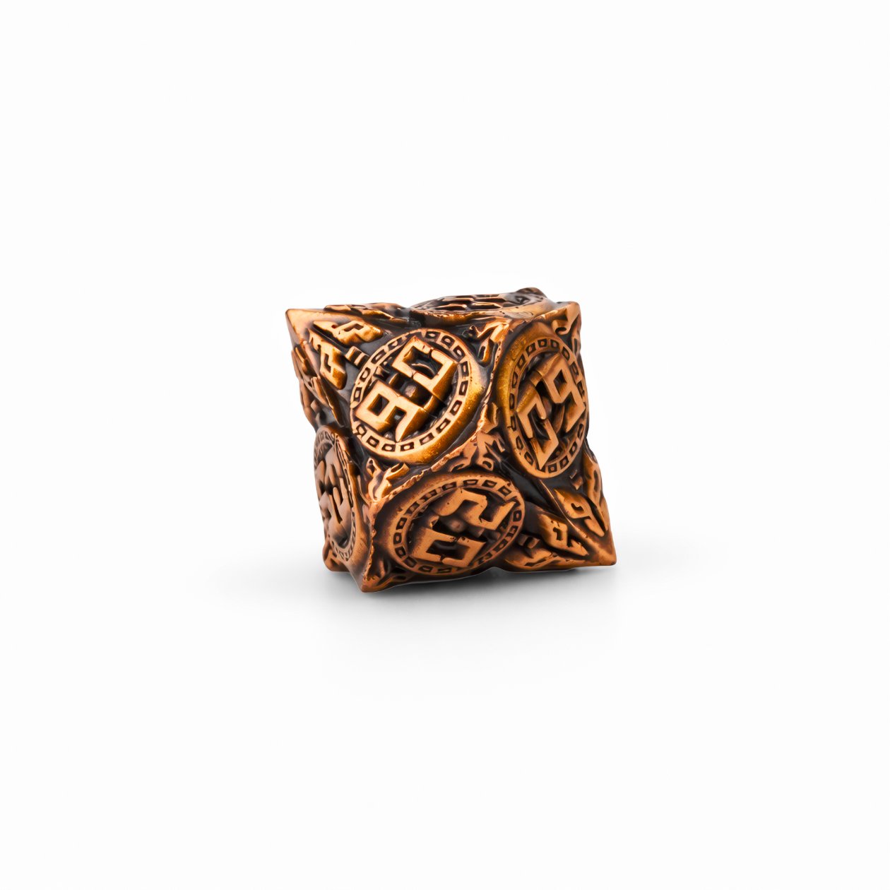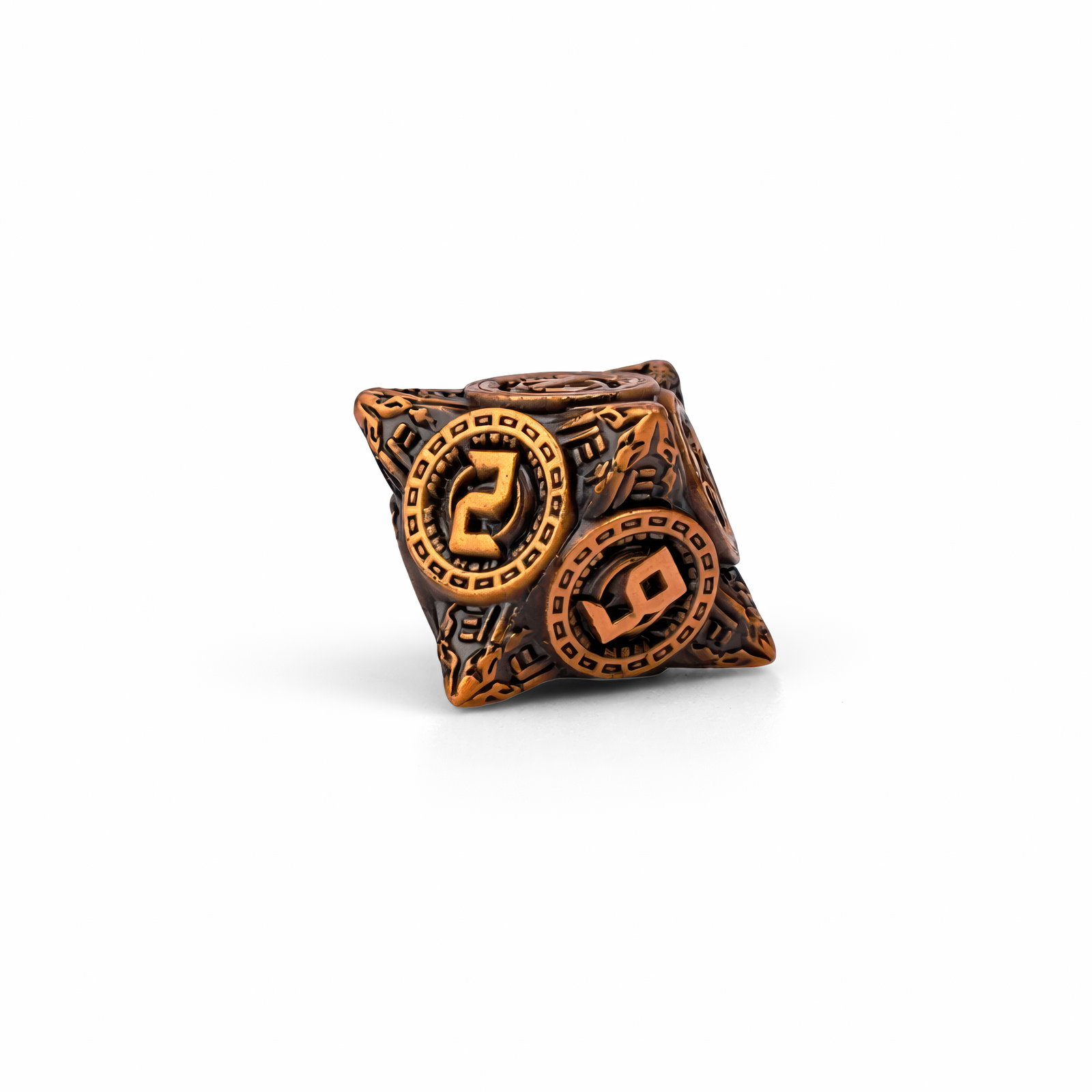 Z mglistych warsztatów pełnych kół zębatych i mosiężnych doków sterowców, Antique Copper Solid Set wnosi czysty steampunkowy klimat do każdego rzutu—od razu podkręcając Twoją sesję, półkę z kolekcją albo cosplay. Ten 3-centymetrowy zestaw metalowych kości łączy ciepły odcień antycznej miedzi z ciemnymi, przydymionymi zagłębieniami, dzięki czemu każdy detal wygląda jak wyjęty z wiekowej, mechanicznej konstrukcji. Na ściankach widać wypukłe, „monetowe” medaliony z mocno stylizowanymi cyframi, otoczone ramką z drobnymi kwadratowymi „zębami” jak w trybach zegara. Pomiędzy nimi powierzchnia jest gęsto rzeźbiona—filigran, ornamenty i rowkowane podziały pięknie łapią światło, gdy obracasz kość w dłoni. Dostajesz komplet siedmiu kości (d4, d6, d8, d10, procentową, d12 i d20) gotowych na wieczory RPG, ekspozycję albo mały „talizman szczęścia” przy karcie postaci. To zestaw, który wygląda jak gadżet kapitana sterowca lub genialnego majsterkowicza—dorzuć go do swojej kolekcji i niech kolejna przygoda zaskoczy jak precyzyjny mechanizm.