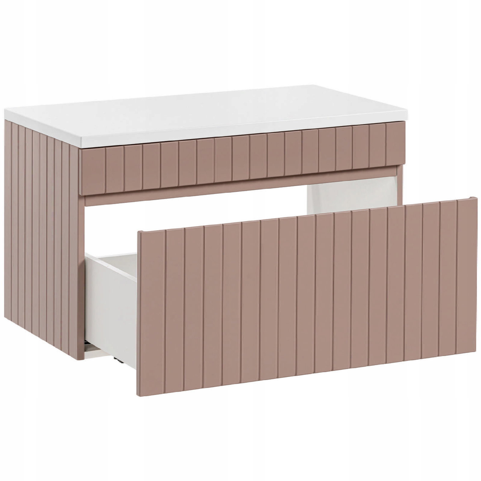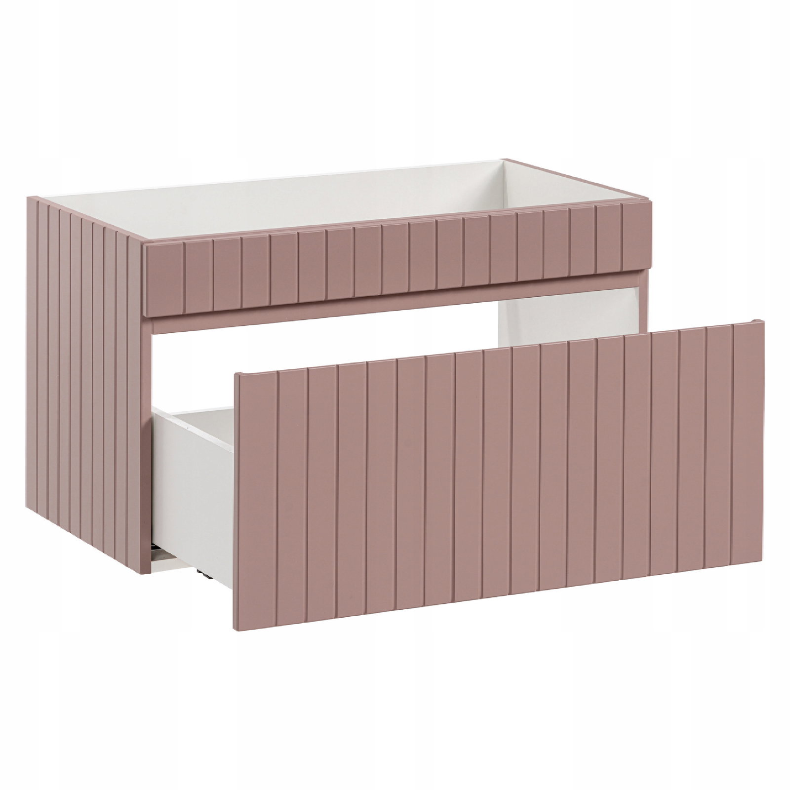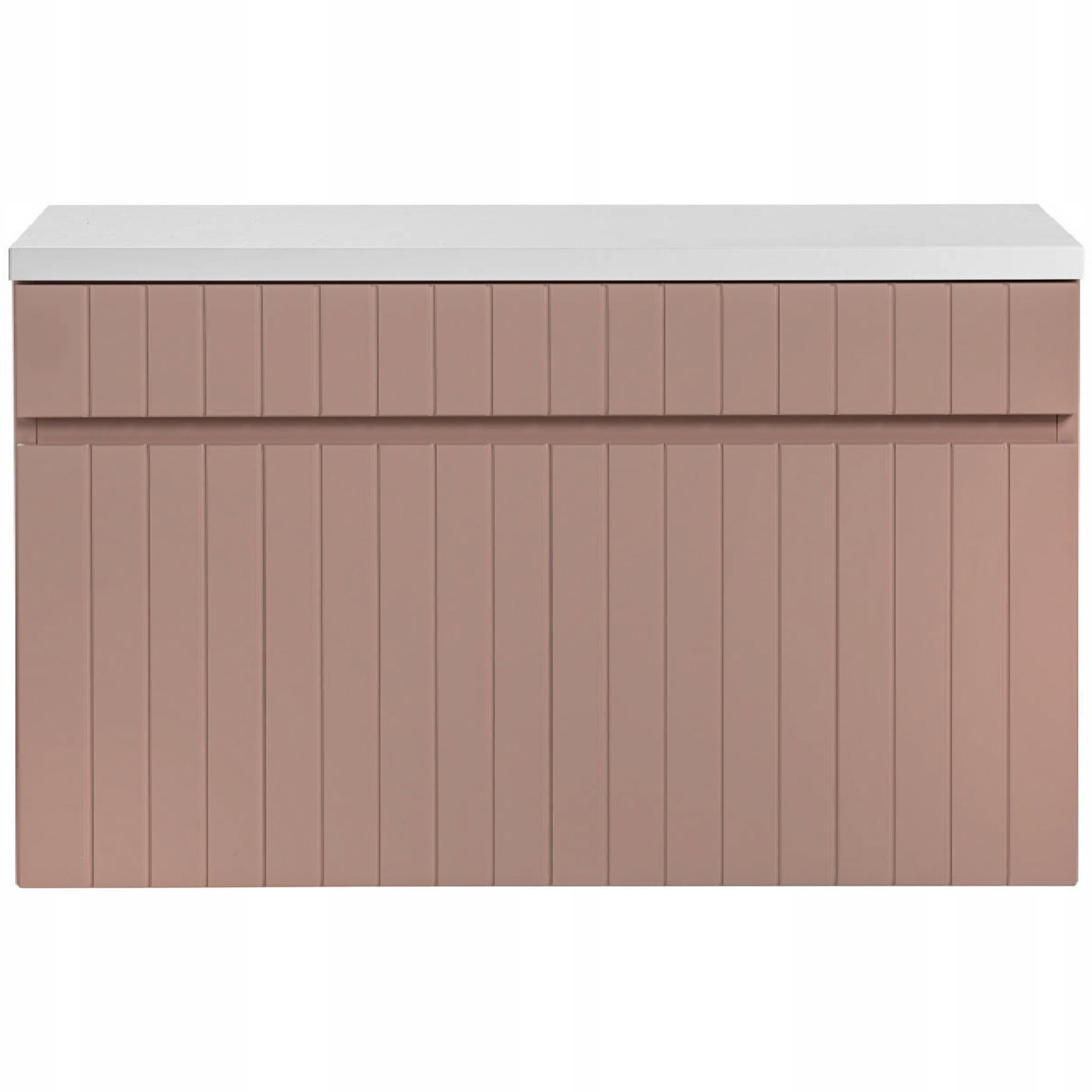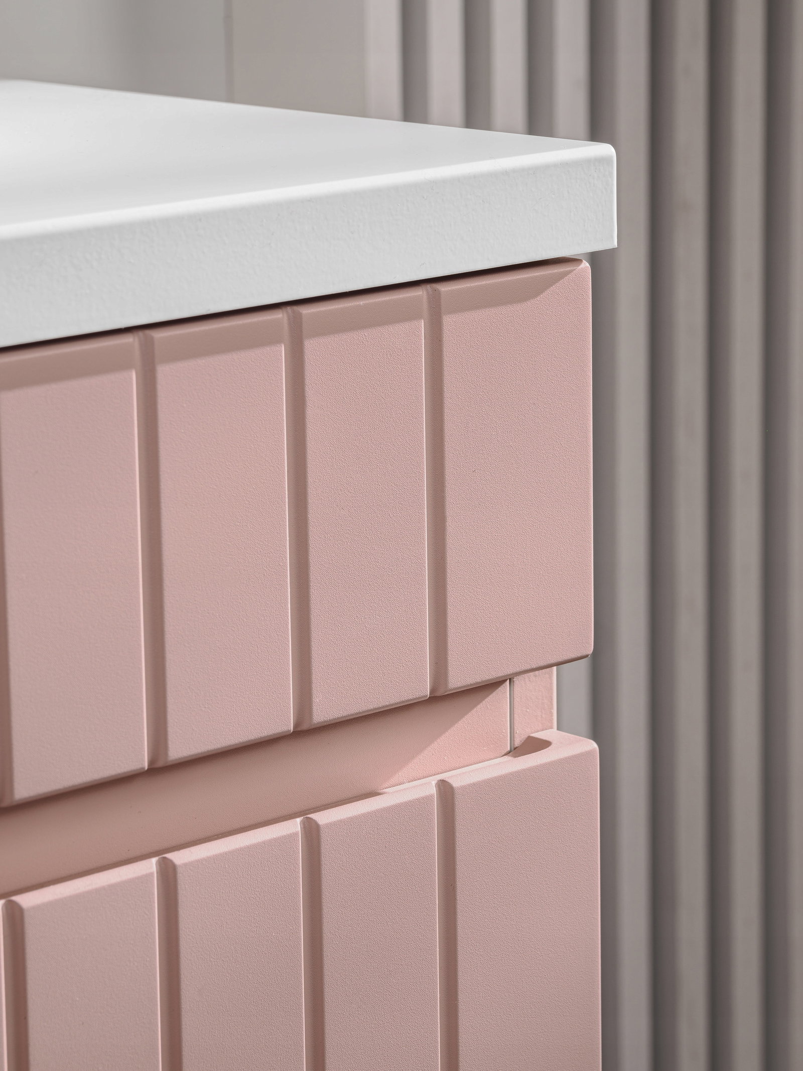 Jej wyjątkowym elementem jest pionowe ryflowanie oraz zintegrowany podchwyt, które nadają meblom delikatnego, a zarazem nowoczesnego wyglądu. Meble w różowym kolorze, doskonale współgrające z blatami Iconic White, tworzą harmonijne zestawienie kolorystyczne, które przyciąga wzrok i pasuje do nietuzinkowych aranżacji łazienek.