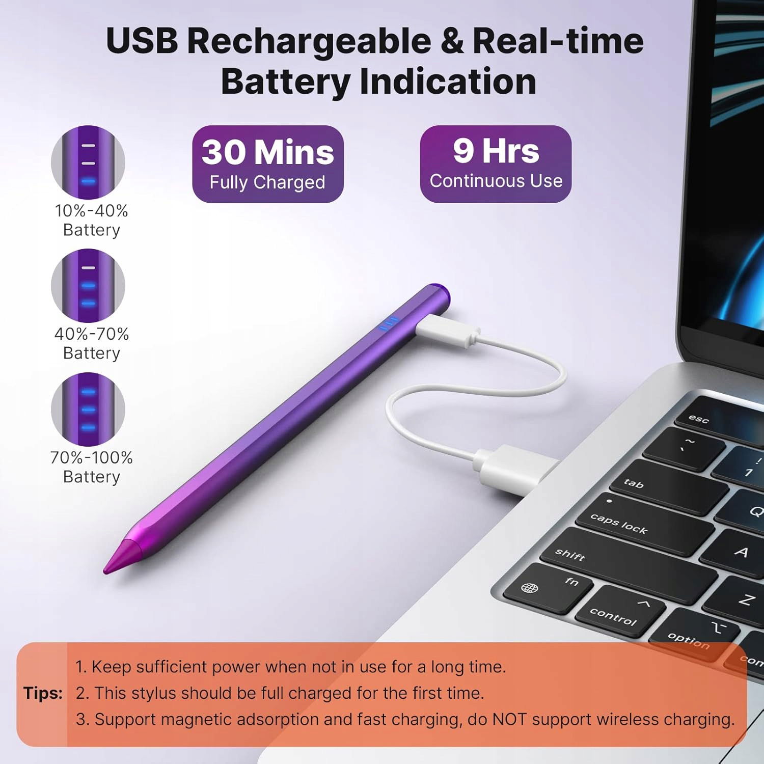 - ➡️【Szybkie ładowanie i wskaźnik zasilania】: Rysik do iPencil z portem ładowania typu C ładuje się w pełni w ciągu 30-35 minut i obsługuje do 10 godzin użytkowania. Wyłącza się automatycznie po 10 minutach bezczynności, aby oszczędzać energię. Wyposażony w 4 wbudowane lampki kontrolne, zapewnia wyraźny i wygodny wyświetlacz zasilania. Wyświetlacze zasilania: 4 włączone lampki: 75%-100% mocy, 3 włączone lampki: 50%-75% mocy, 2 włączone lampki: 25%-50% mocy, 1 włączone lampki: 1%-25% mocy.