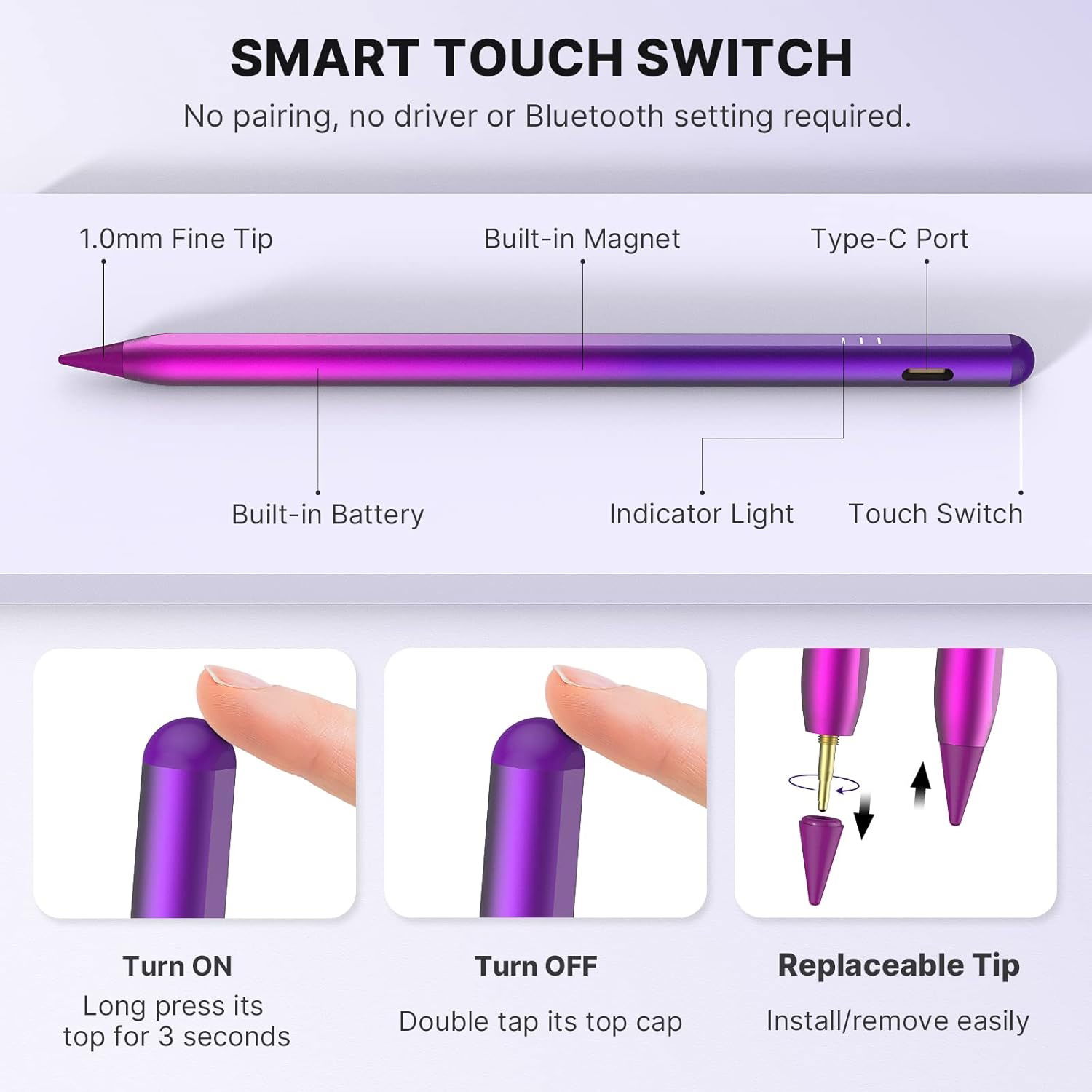- ➡️【Adsorpcja magnetyczna i przełącznik dotykowy】: Wbudowany magnes w rysiku do iPada zapewnia silniejsze przyciąganie, bezpiecznie trzymając rysik z boku iPada. Zapobiega to ześlizgnięciu się rysika lub jego zgubieniu. Apple Pencil nie wymaga połączenia Bluetooth. Włącz ten rysik, po prostu dotykając dwukrotnie przycisku nasadki, dotknij dwukrotnie, aby wyłączyć.