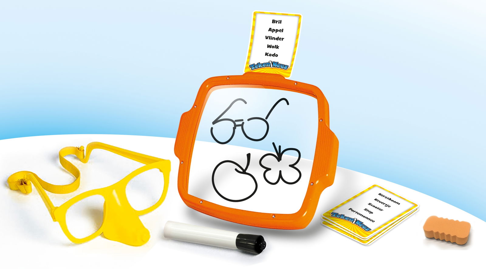 Megableu TekenNeus to zabawna gra rodzinna, w której wszystko rysujesz… ale nie rękami, tylko nosem. Zakładasz specjalne okulary TekenNeus ze stifthouderem, losujesz kartę i próbujesz odwzorować słowa na tablicy suchościeralnej. Inni gracze muszą odgadnąć, co próbujesz narysować. To gwarancja śmiechu i świetnej zabawy podczas każdej rozgrywki.