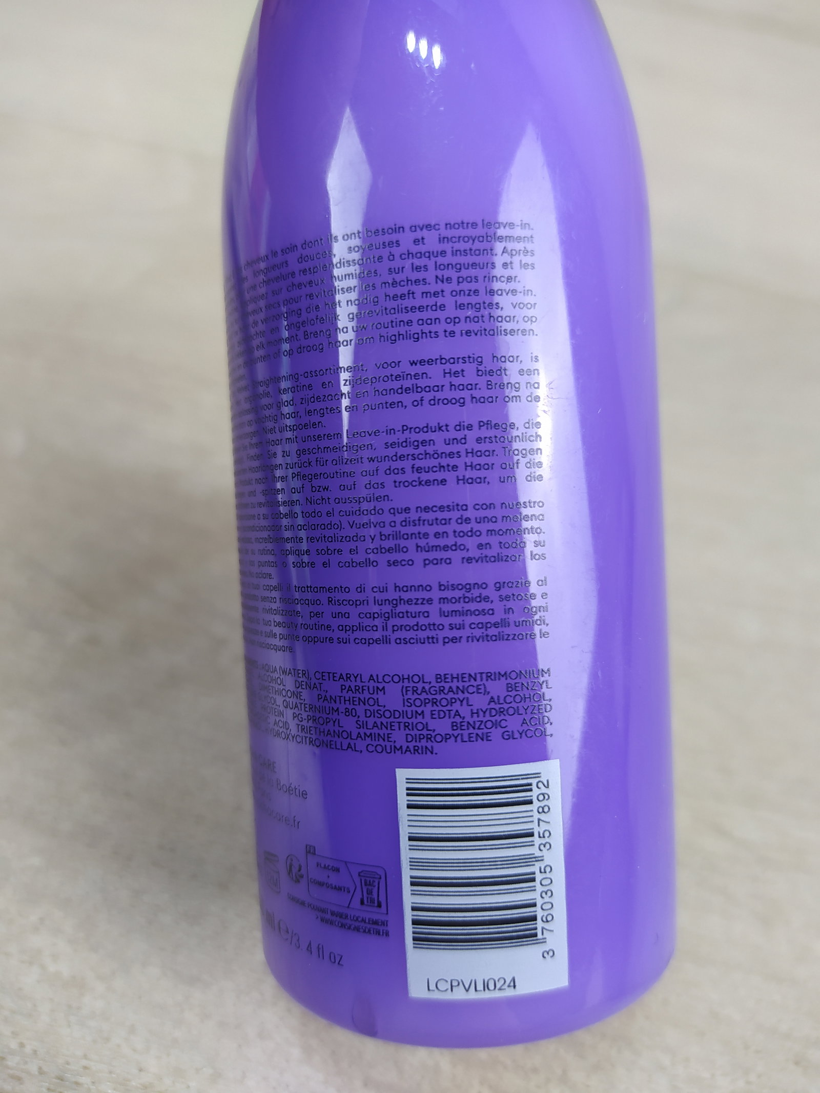 Ingrédients : AQUA (WATER), CETEARYL ALCOHOL, BEHENTRIMONIUM CHLORIDE, ALCOHOL DENAT., PARFUM (FRAGRANCE), BENZYL ALCOHOL, DIMETHICONE, PANTHENOL, ISOPROPYL ALCOHOL, PROPYLENE GLYCOL, QUATERNIUM-80, DISODIUM EDTA, HYDROLYZED VEGETABLE PROTEIN PG-PROPYL SILANETRIOL, BENZOIC ACID, DEHYDROACETIC ACID, TRIETHANOLAMINE, DIPROPYLENE GLYCOL, TOCOPHEROL, HYDROXYCITRONELLAL, COUMARIN.