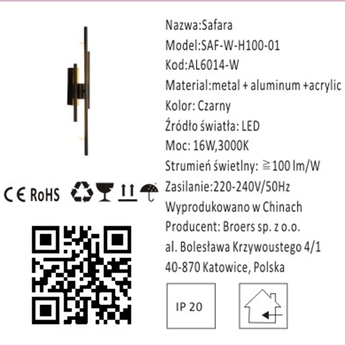 - Kompatybilność z Standardowym Zasilaniem: Lampa Safara jest dostosowana do standardowego zasilania o napięciu 220-240V i częstotliwości 50Hz, co ułatwia jej instalację.