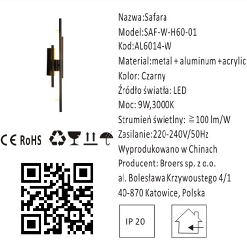 - Ochrona Przed Cieczą: Należy jednak pamiętać, że lampa Safara posiada stopień ochrony IP20, co oznacza, że jest przeznaczona głównie do użytku w suchych pomieszczeniach.