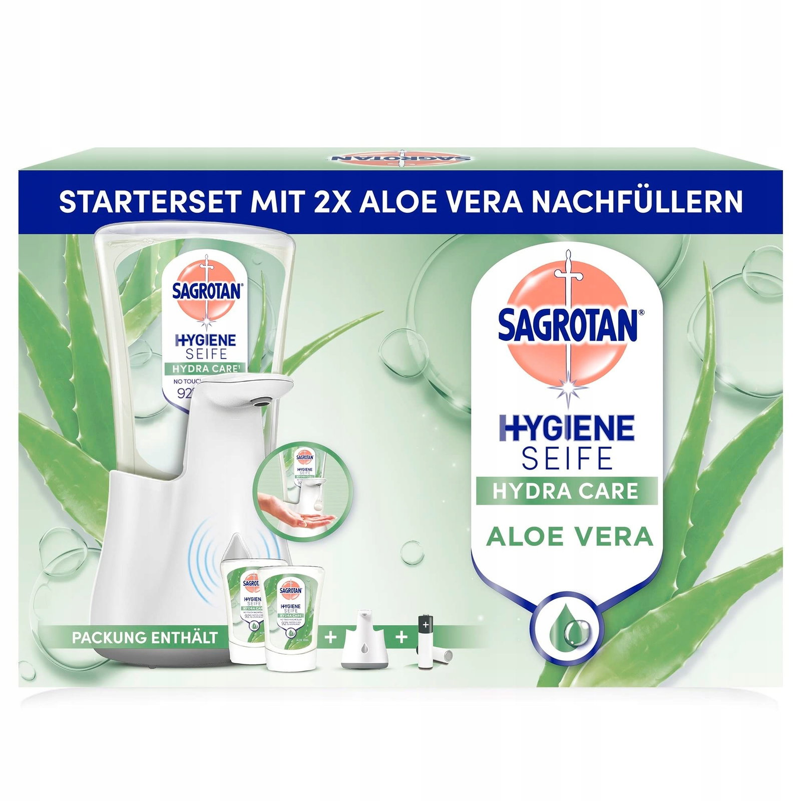 Zawartość opakowania: 1 x dozownik mydła w płynie Sagrotan No-Touch biały z czujnikiem ruchu (nie można myć w zmywarce) / 2 x wkład Sagrotan No-Touch Aloe Vera 250 ml