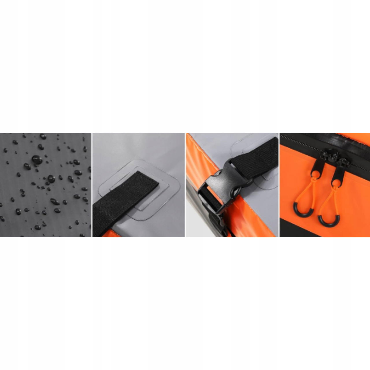 Wysokiej jakości tkanina 1000D PCW gwarantuje odporność na trudne warunki pogodowe. Zgrzewane szwy oraz solidne zamki błyskawiczne chronią wnętrze torby przed wilgocią i zabrudzeniem.