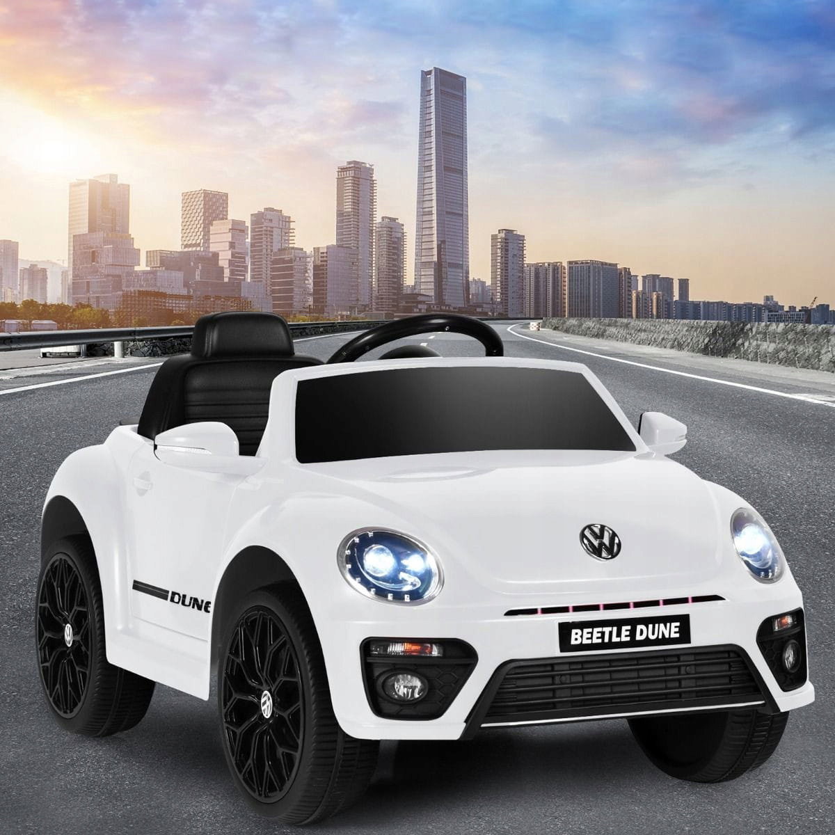 Elektryczny Beetle dla dzieci: ten samochód dla dzieci posiada oficjalną licencję Volkswagen Beetle i ma realistyczny wygląd. Drzwi mogą się otwierać i zamykać, a reflektory mogą pozostać włączone lub migać razem z oświetleniem deski rozdzielczej, dzięki czemu samochód wygląda realistycznie i atrakcyjnie.