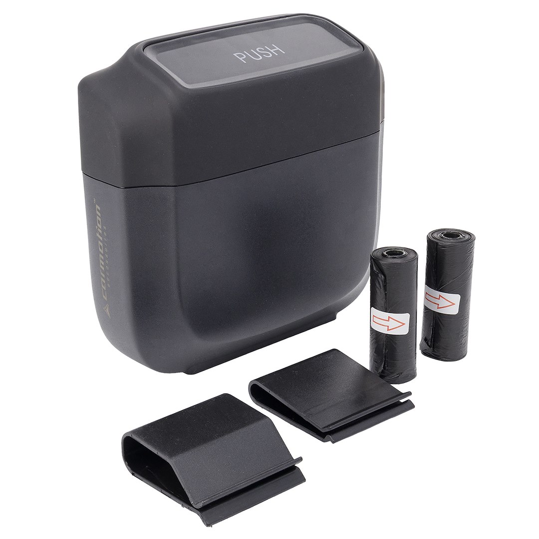 Produkt wyposażony jest w jednorazowe worki, które ułatwiają wymianę i zapewniają higieniczne użytkowanie. Stabilna konstrukcja zapobiega przewracaniu się pojemnika podczas jazdy, a szczelne zamknięcie ogranicza wydostawanie się zapachów. Neutralny, estetyczny design pasuje do wnętrza większości samochodów.