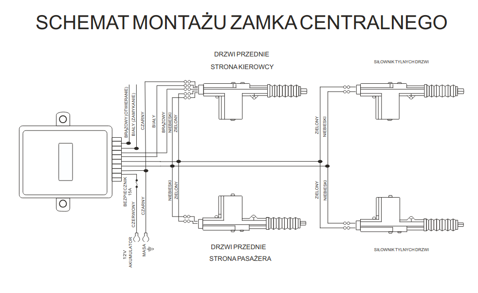 Moduł pozwala na sterowanie elektrycznymi siłownikami zamka centralnego. Do działania potrzebuje zasilania 12 V, bezpiecznika 15 A (w ofercie mamy gniazda bezpieczników i bezpieczniki) oraz sygnałów otwierania i zamykania (na osobnych kablach).