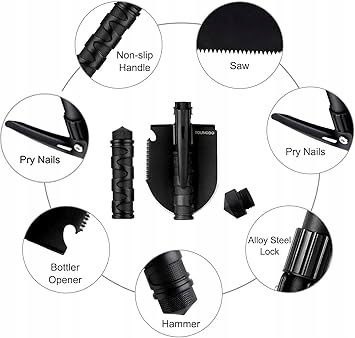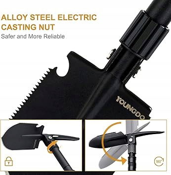 ✿【WIELOFUNKCYJNA ŁOPATA】: Mini składana koparka ma 10 funkcji: łopata, motyka, siekanie, planowanie, motyka, młotek bezpieczeństwa, otwieracz do butelek, piła, siekanie warzyw. Składana koparka wojskowa może dostosować powierzchnię koparki do 0-180 stopni, obracając środkowy wał, i łatwo zmienić koparkę na motykę, struganie i kilof. Za pomocą składanej łopaty możesz ciąć gałęzie, uciekać. Mechaniczna koparka wielofunkcyjna pełni wiele funkcji.