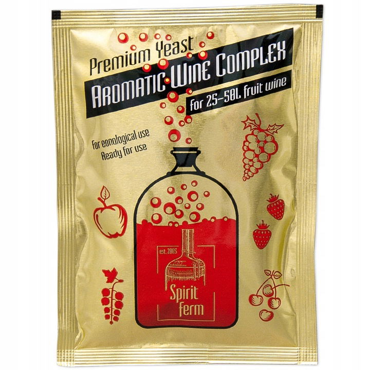 SpiritFerm Aromatic Wine Complex to gotowy do użycia pakiet drożdży winiarskich, pożywki oraz enzymu pektolitycznego, idealny do produkcji każdego rodzaju wina.