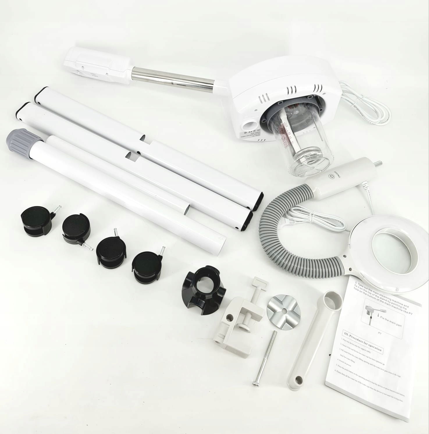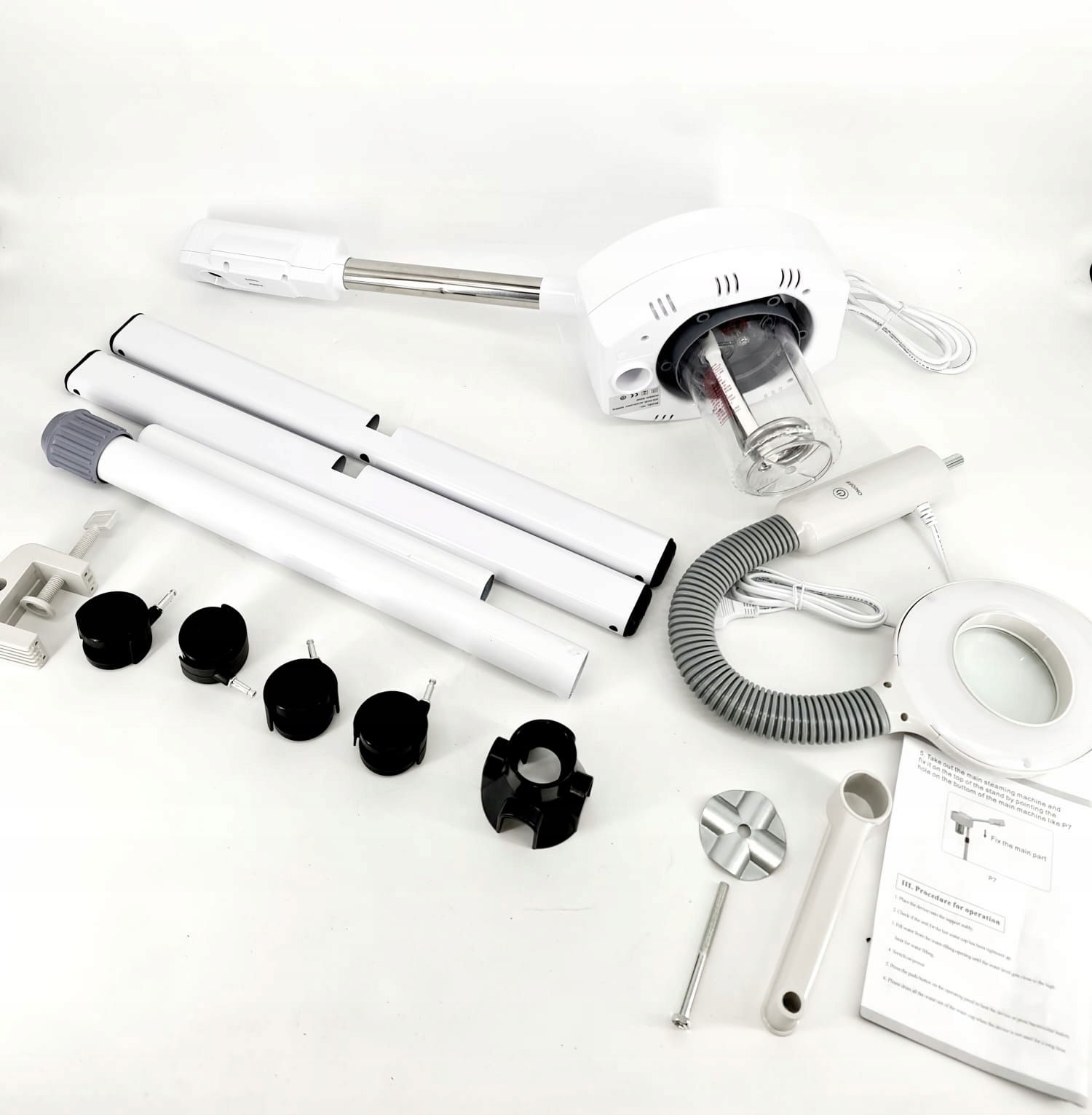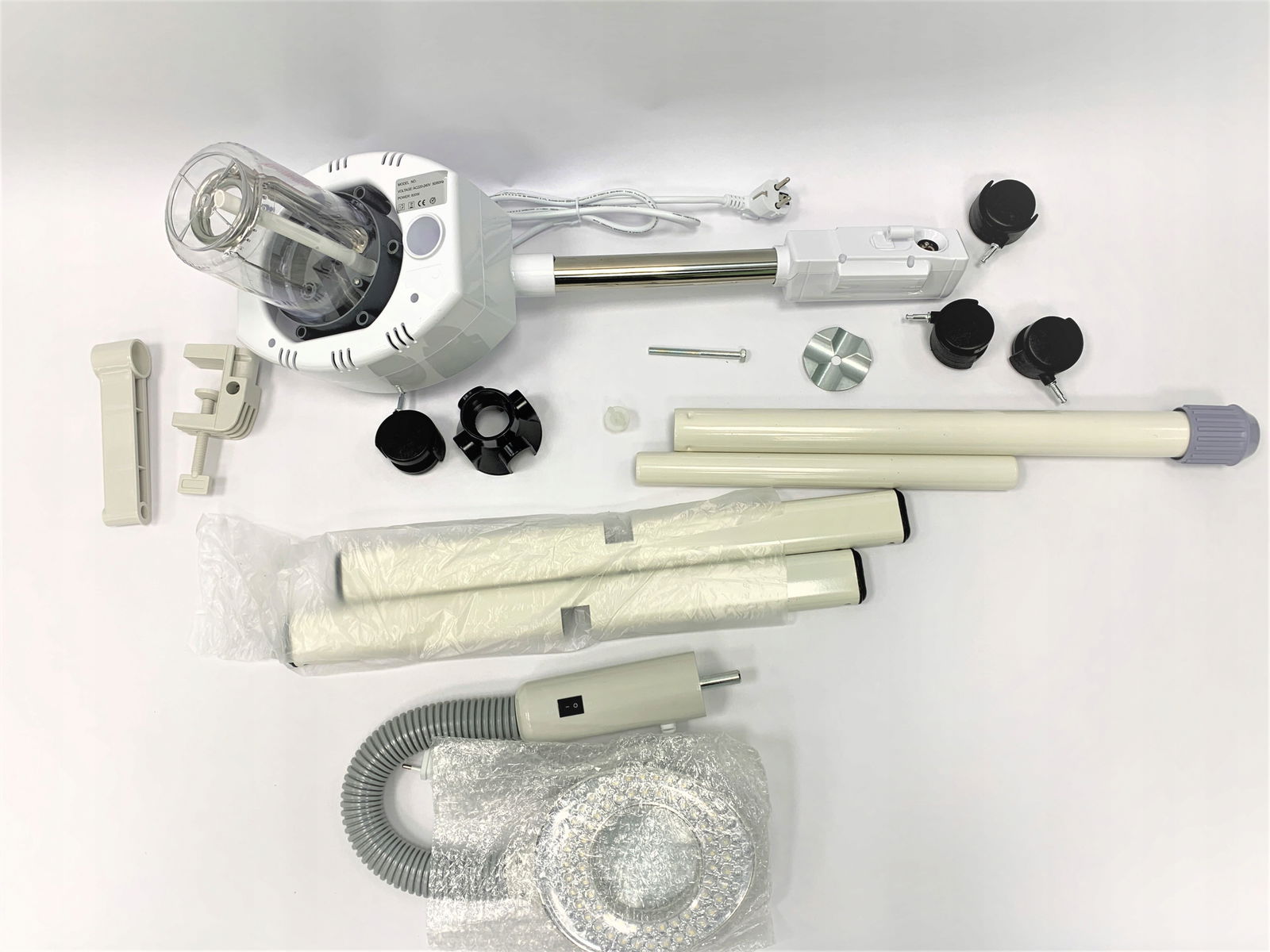 - 🔧 Dowolna pozycja: Regulacja wysokości, obracana o 360° dysza oraz ramię z lampą zapewniają pełną elastyczność i możliwość dopasowania urządzenia do Twoich potrzeb. Dzięki kółkom, urządzenie jest łatwe w przemieszczaniu, co zwiększa jego funkcjonalność w każdym miejscu.