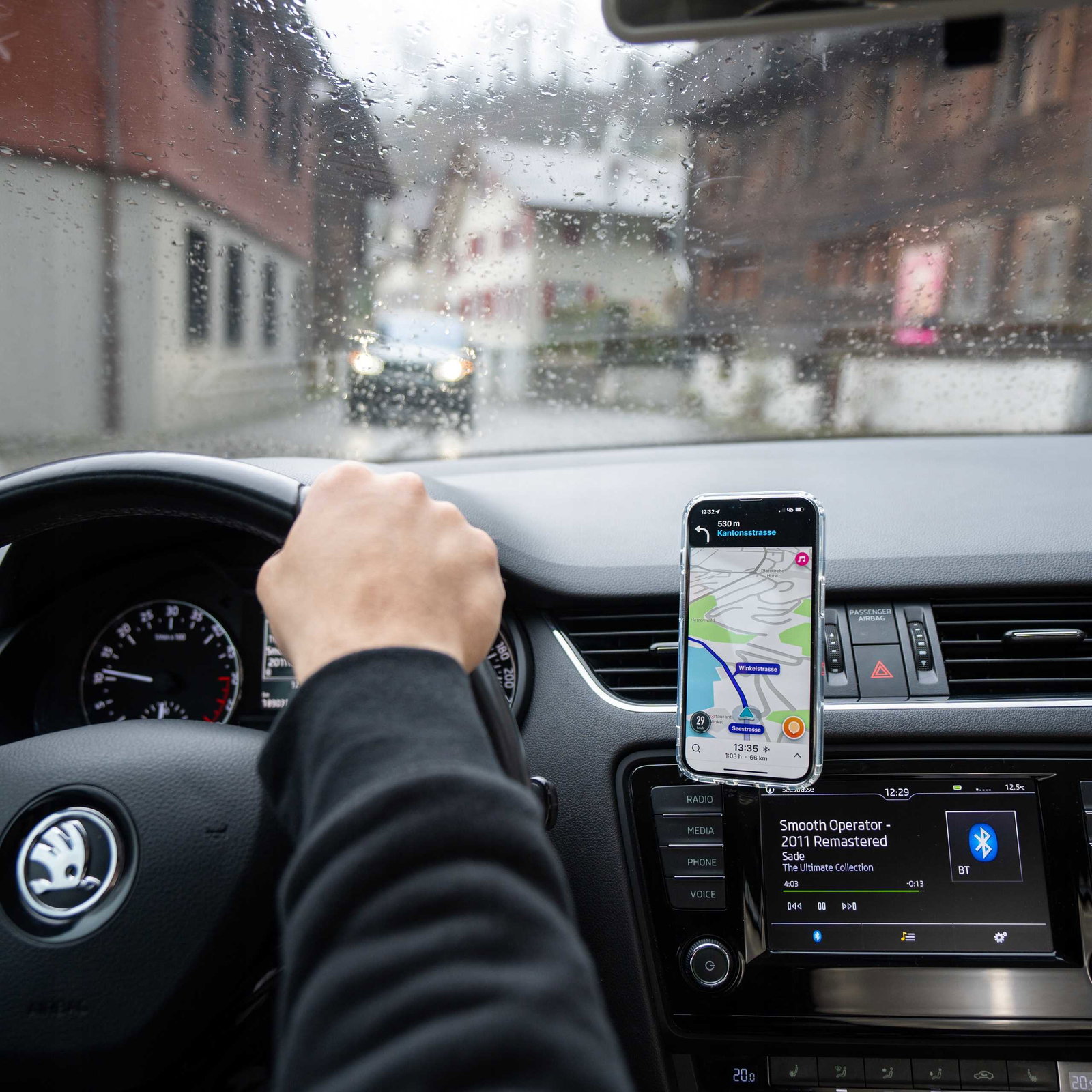 Optymalna pozycja + łatwa obsługa jedną ręką = bezpieczeństwo jazdy