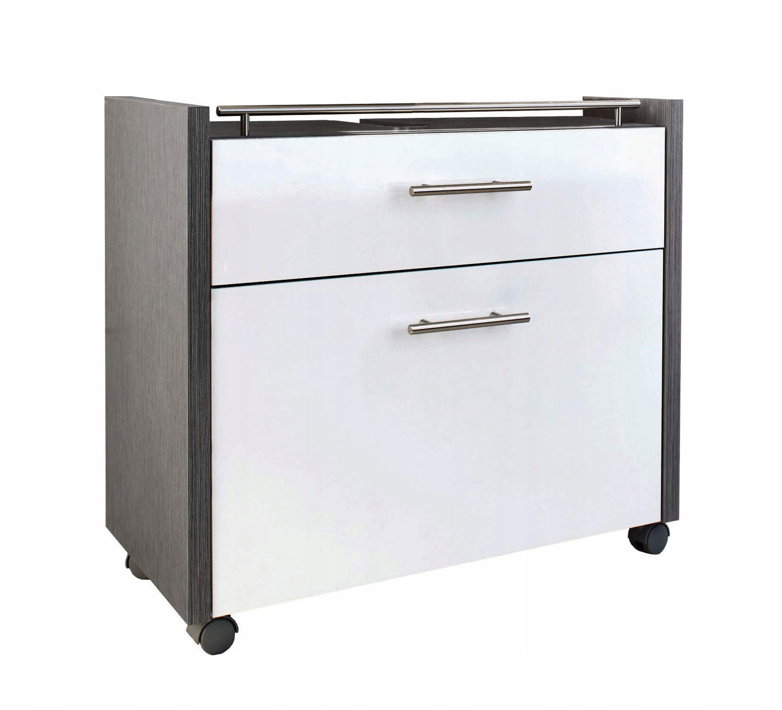 Wysokiej jakości metalowe uchwyty i okucia. Górna ziemia z poręczą. Fronty lakierowane. Na 4 kółkach, 2 z nich zamykane. Szafka na umywalkę z 2 częściami wysuwanymi z płyty wiórowej pokrytej żywicą melaminową.