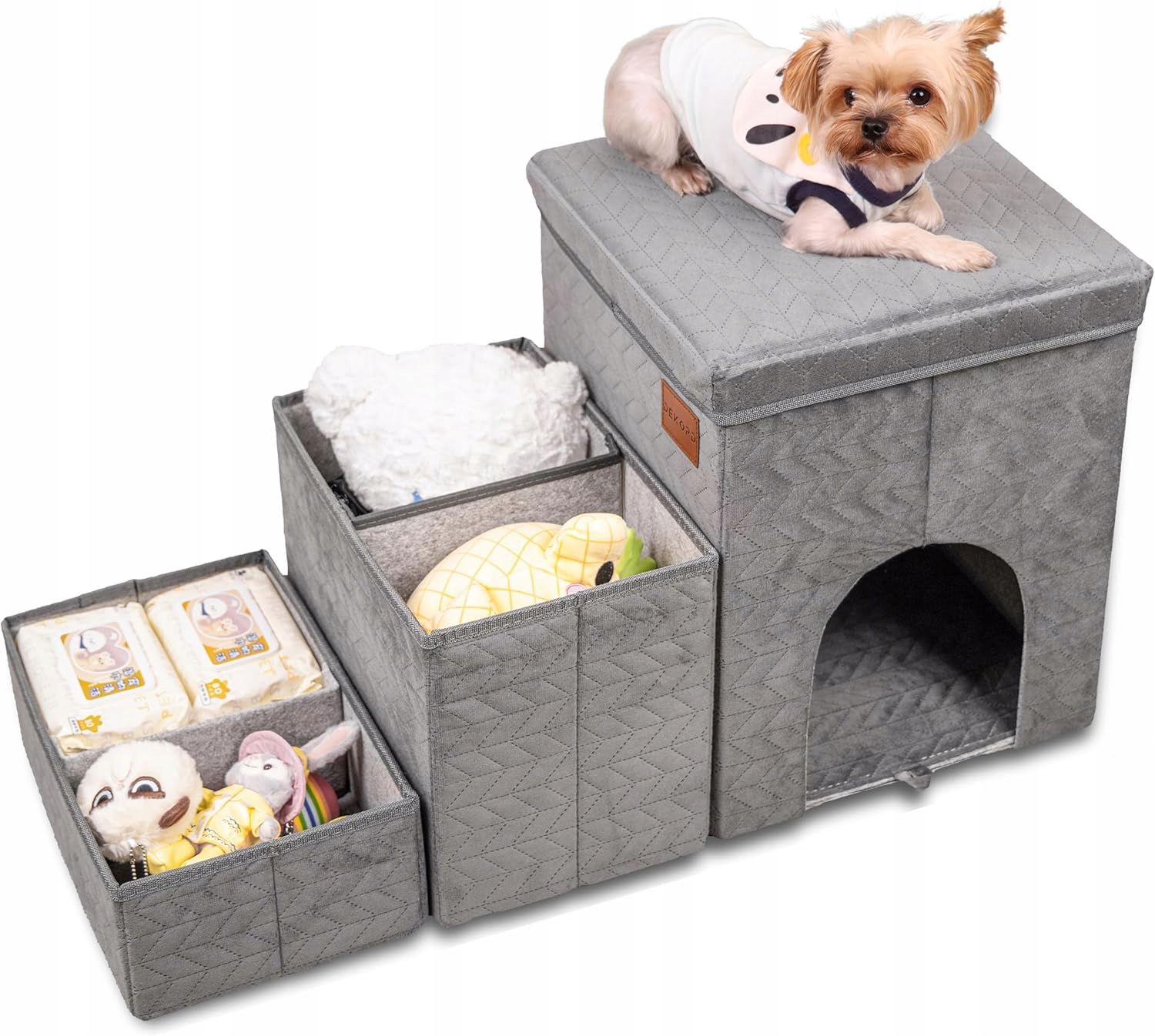 Pod dolną częścią konstrukcji znajduje się funkcjonalna przestrzeń do przechowywania. To idealne miejsce na zabawki, smycze, szelki czy przysmaki. Właściciel zyskuje porządek, a wszystko, co potrzebne podczas codziennych aktywności, jest zawsze pod ręką. Schodki łączą w sobie elegancję z praktycznością, której na co dzień naprawdę brakuje.