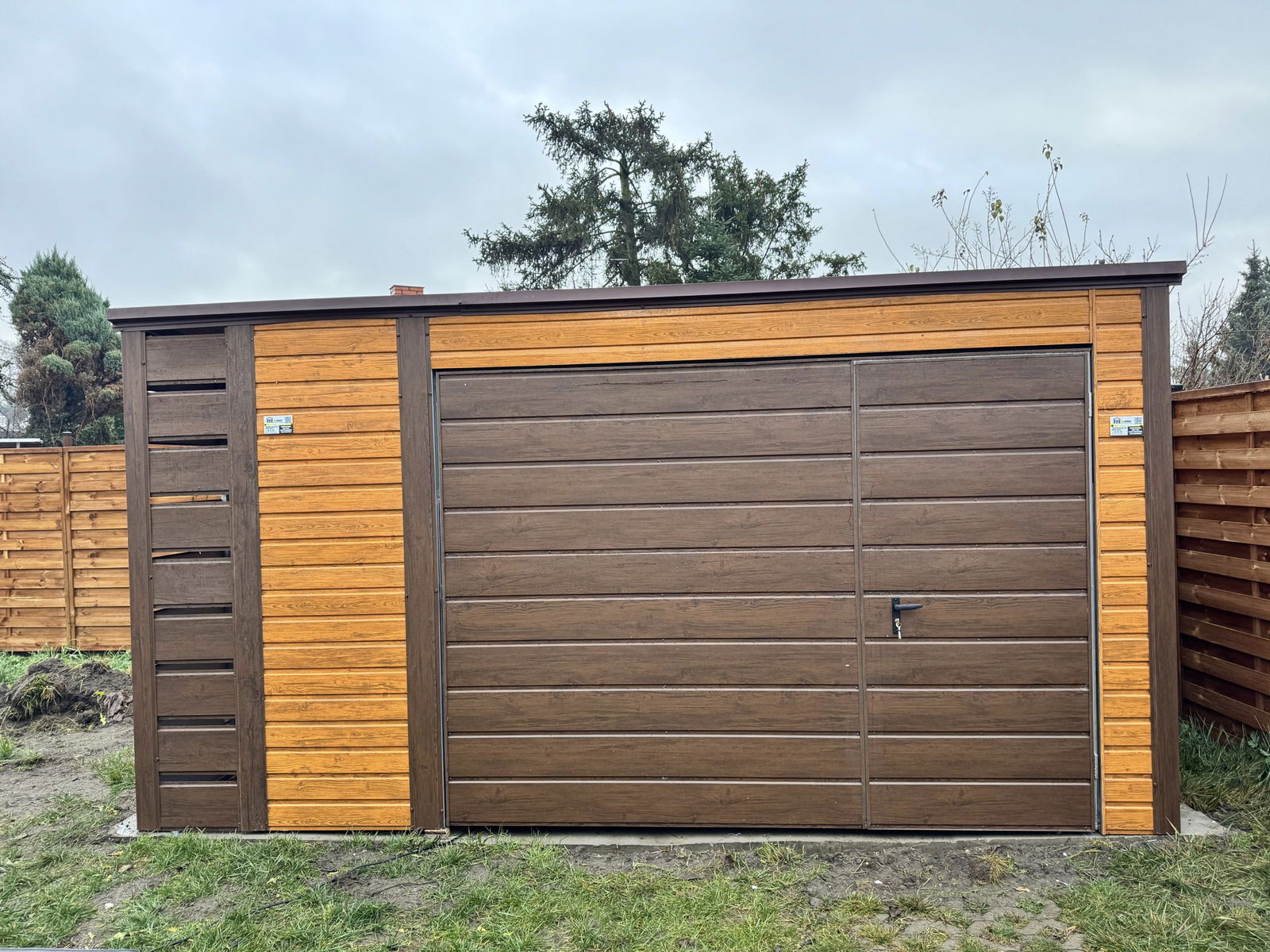 • szerokość: 4 m • długość: 3m • wiata 0,5x3m zabudowana przód i połowa bocznej ściany panelami Ciemny orzech • dach: spad w tył kolor Ciemny brąz RAL8017 • Brama uchylna 300x200 cm przetłoczenie poziom T17 kolor Ciemny orzech • Drzwi w bramie uchylnej 90x200 cm przetłoczenia T17 kolor Ciemny orzech • Przetłoczenie ścian T7 poziom jasny orzech • wysokość ściany przedniej: 233 cm • wysokość ściany tylnej: 210 cm • Wysokość światła wjazdu 190 cm • Konstrukcja - profil zamknięty ocynk • Zamek + Klucze • nity + wkręty w kolorze garażu • obróbki ścian Ciemny orzech • obróbki dachu Ciemny brąz RAL8017