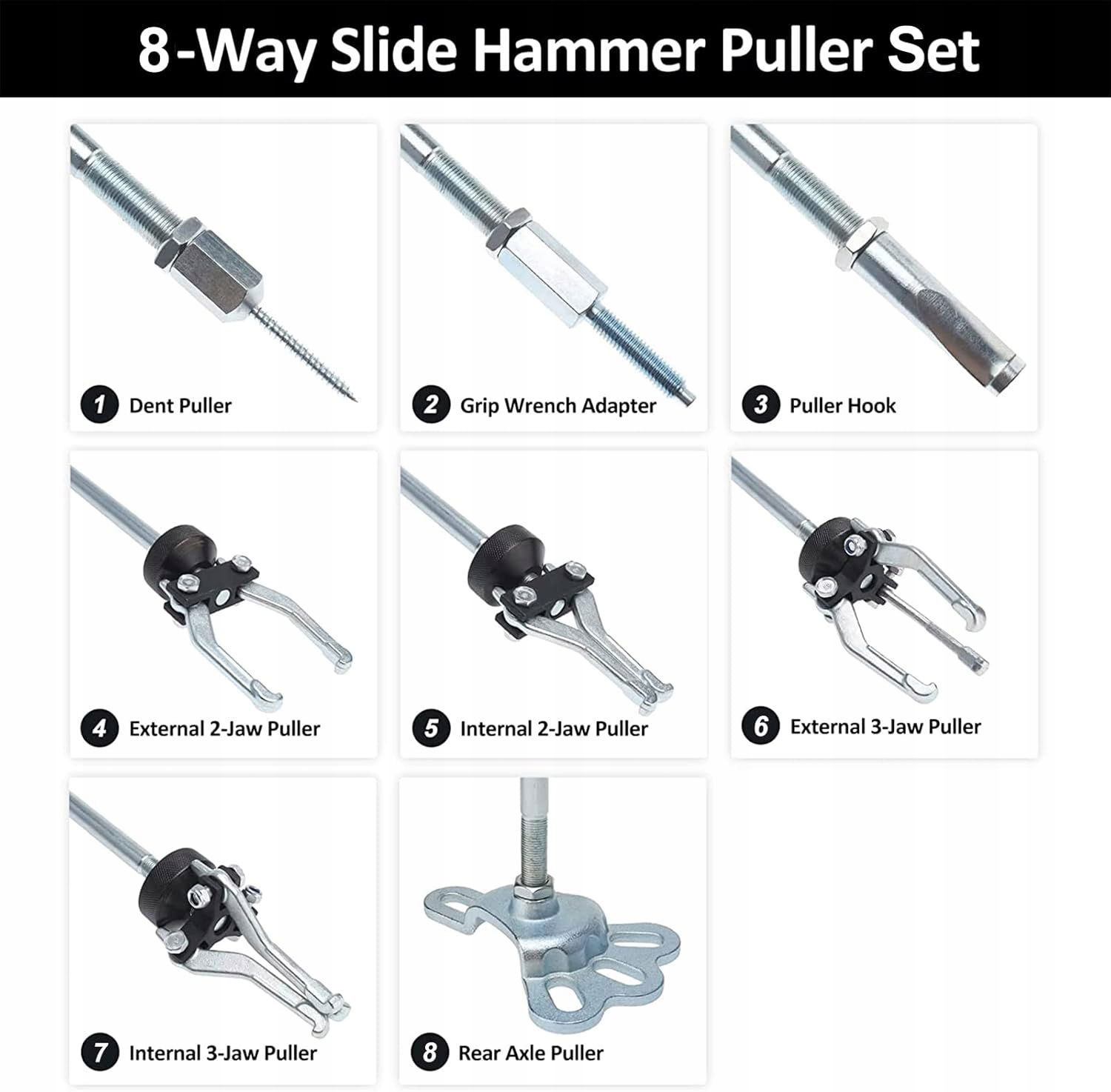 Istnieje wiele kombinacji, w tym wewnętrzny dźwigarka 2 szczęki, wewnętrzny ściągacz 3 szczęki, zewnętrzny ciągnik 2 szczęki, zewnętrzny ściągacz szczęki, zewnętrzny ciągnik 3 szczęki, adapter klucza uchwytu, ściągacz wgniecenia, zaczep uszczelnienia i adapter ciągnienia.