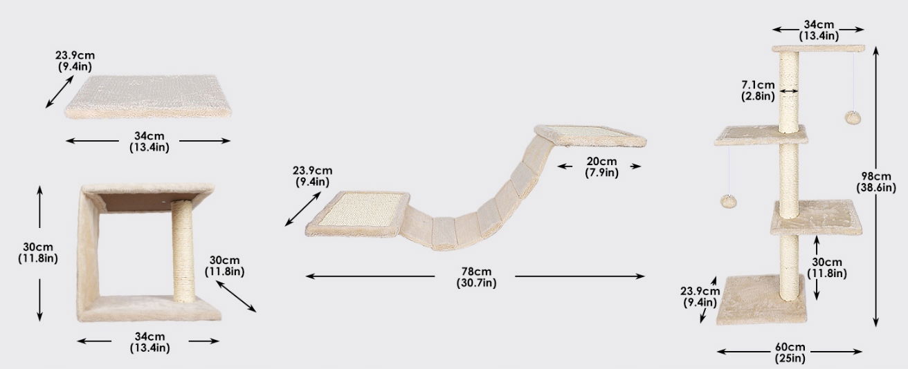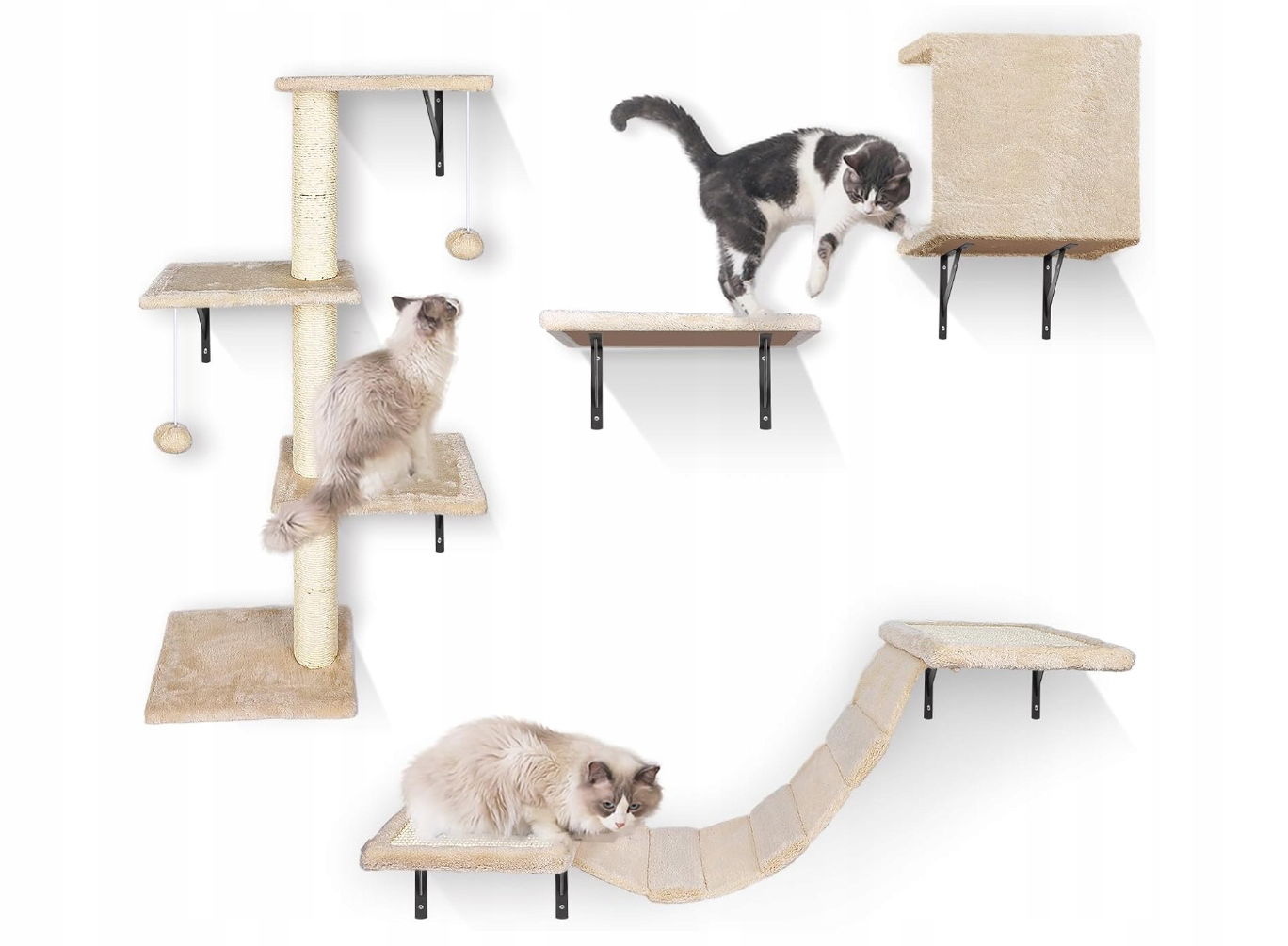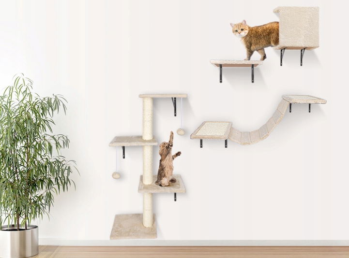 - ✴️【Zestaw mebli dla kota】: Zestaw mebli dla kota składa się z czterech elementów, w tym półek, domku dla kota, mostka i drapaka. Zapewnia kotom miejsce do wspinania się i ćwiczeń, pozwalając im na pełen relaks i dbanie o zdrowie. Jednocześnie pomaga uwolnić energię i zapobiega niszczeniu mebli przez koty. Zmęczone zabawą koty mogą również odpocząć w hamaku lub domku.