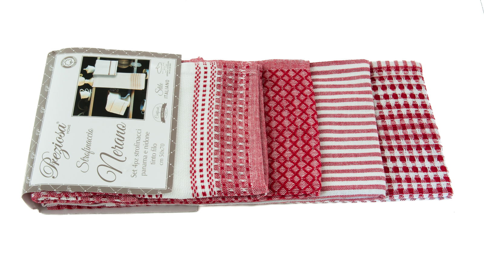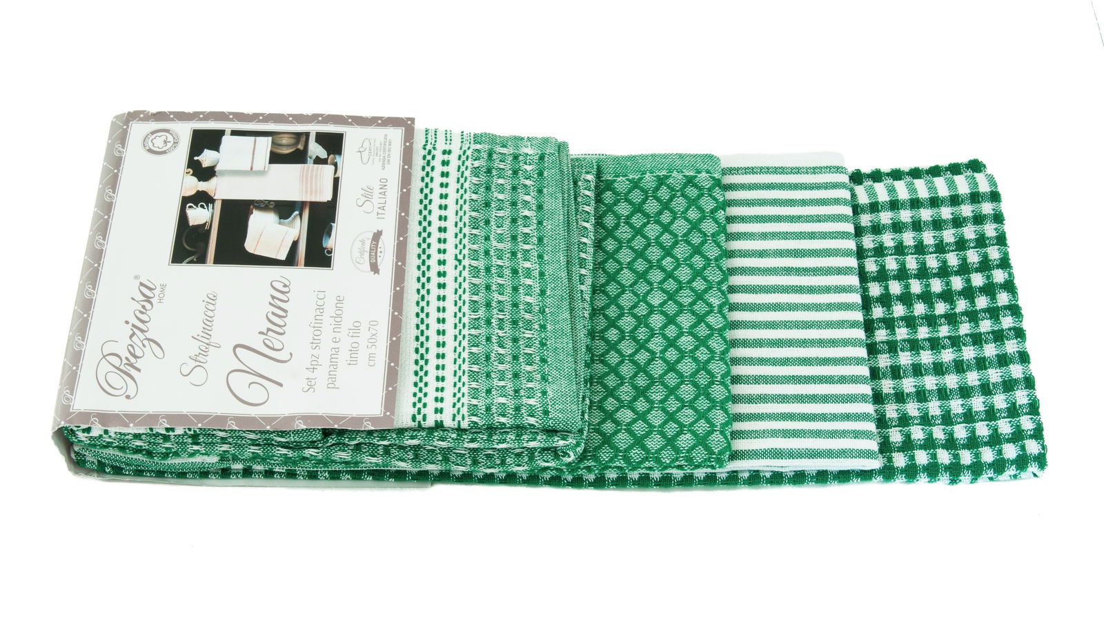 Zestaw składający się z czterech ściereczek kuchennych marki PREZIOSA HOME SOMMARUGA, materiał 100% bawełna, rozmiar 50x70, wykonany w jakości tzw, Tinto filo co oznacza iż używana przędza nie jest barwiona na kawałku tkaniny ale jest barwiona pojedynczo, wcześniej zanim stanie się osnową lub wątkiem tkaniny. Tinto filo jest synonimem wysokiej jakości, Doskonałe do codziennego użytku. Produkt posiada certyfikat stylu włoskiego, certyfikat jakości. Firma certyfikowana międzynarodowym QUALITY ASSURANCE ISO 9001. UNI EN ISO 9001.