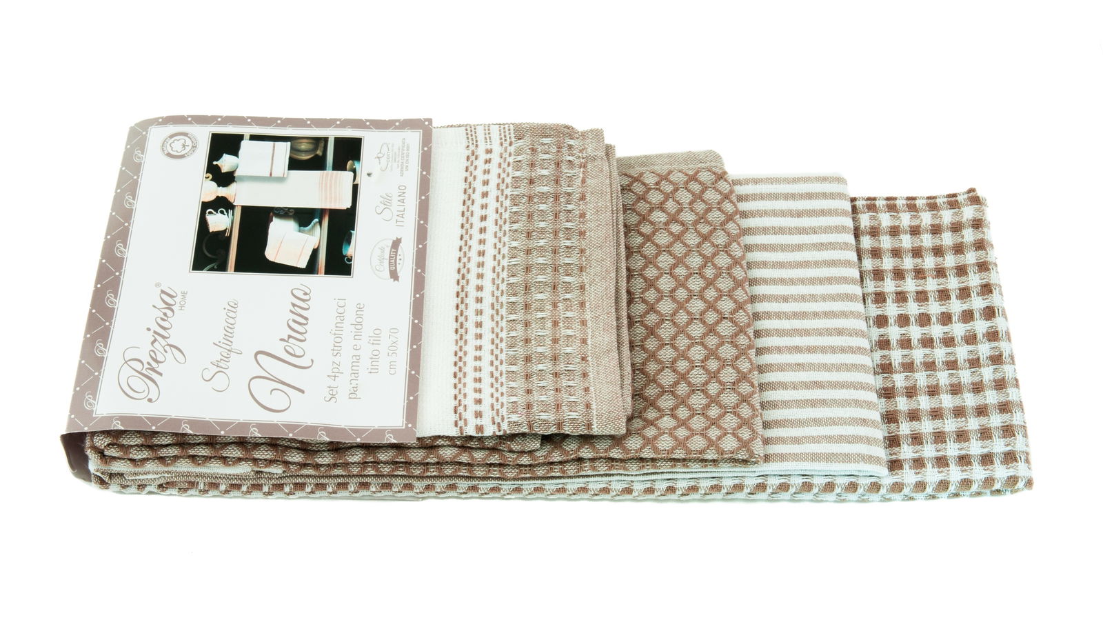 Zestaw składający się z czterech ściereczek kuchennych marki PREZIOSA HOME SOMMARUGA, materiał 100% bawełna, rozmiar 50x70, wykonany w jakości tzw, Tinto filo co oznacza iż używana przędza nie jest barwiona na kawałku tkaniny ale jest barwiona pojedynczo, wcześniej zanim stanie się osnową lub wątkiem tkaniny. Tinto filo jest synonimem wysokiej jakości, Doskonałe do codziennego użytku. Produkt posiada certyfikat stylu włoskiego, certyfikat jakości. Firma certyfikowana międzynarodowym QUALITY ASSURANCE ISO 9001. UNI EN ISO 9001.