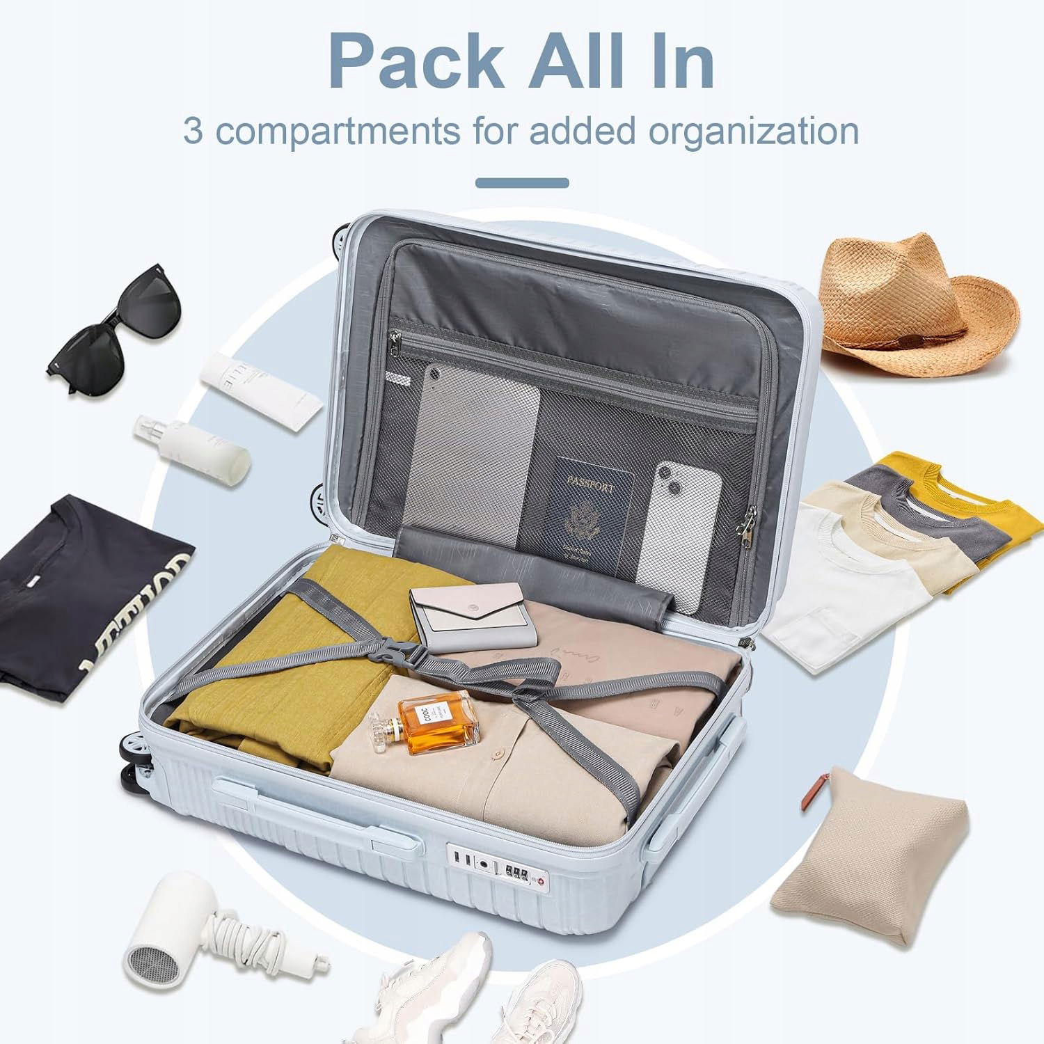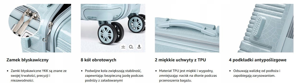 Materiał - walizki wykonane są z twardego materiału PC, są mocne, lekkie i odporne na zarysowania. Aluminiowy uchwyt teleskopowy można przesuwać lub ciągnąć walizkę przy niewielkim wysiłku.