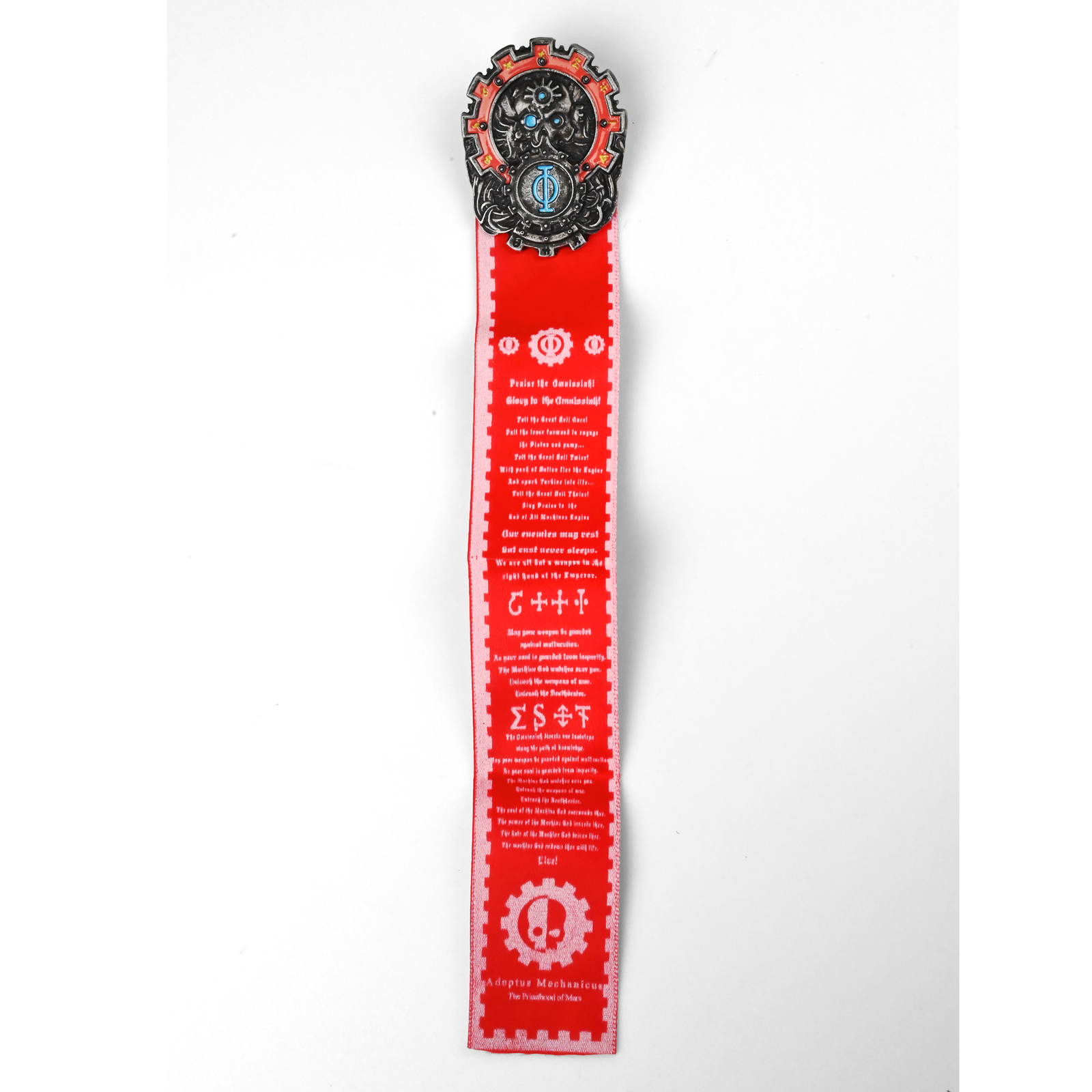 Chwała Omnissjaszowi — noś błogosławieństwo Maszyn z Seal Of Mechanicus. Ten pin o długości 8 cm od razu przyciąga wzrok i dodaje cosplayowej mocy. Metalowy emblemat tworzy warstwowy relief: obwódka zębatki w odcieniu grafitowej stali, podzielona na czerwone, błyszczące segmenty z drobnymi żółtymi znakami, a w środku gęsta faktura rur i nitów z dwoma turkusowymi „oczami”. Niżej spina całość okrągła zębatka z intensywnie niebieskim pierścieniem. W pionie zwisa jaskrawoczerwona wstęga z tkaniny, z białym nadrukiem zębatego obramowania, litanii i symboli kuźni; na końcu widać motyw czaszki w kole zębatym — nawiązanie do heraldyki kodeksowej i znanej ikonografii. Solidny metal daje wyraźne krawędzie i przyjemny ciężar, a jedwabista wstęga dodaje kontrastu. Z tyłu znajdują się dwa bolce z metalowymi zapinkami typu motylek w srebrnym kolorze, więc przypniesz całość pewnie do kurtki, plecaka, smyczy konwentowej albo tablicy ekspozycyjnej. Idealne do cosplayu, na prezent i do kolekcji.