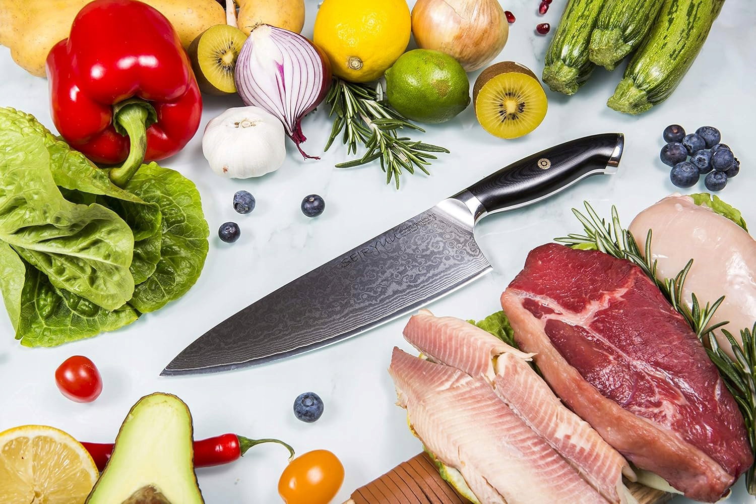 WYWAŻONE CHWYTANIE – nóż kuchenny ze stali damasceńskiej o długości 8 cali (20 cm) jest wygodny i stabilny w użyciu. Punkt równowagi znajduje się blisko czubka ostrza, co pozwala na bardziej zwinne ruchy i ruchy.