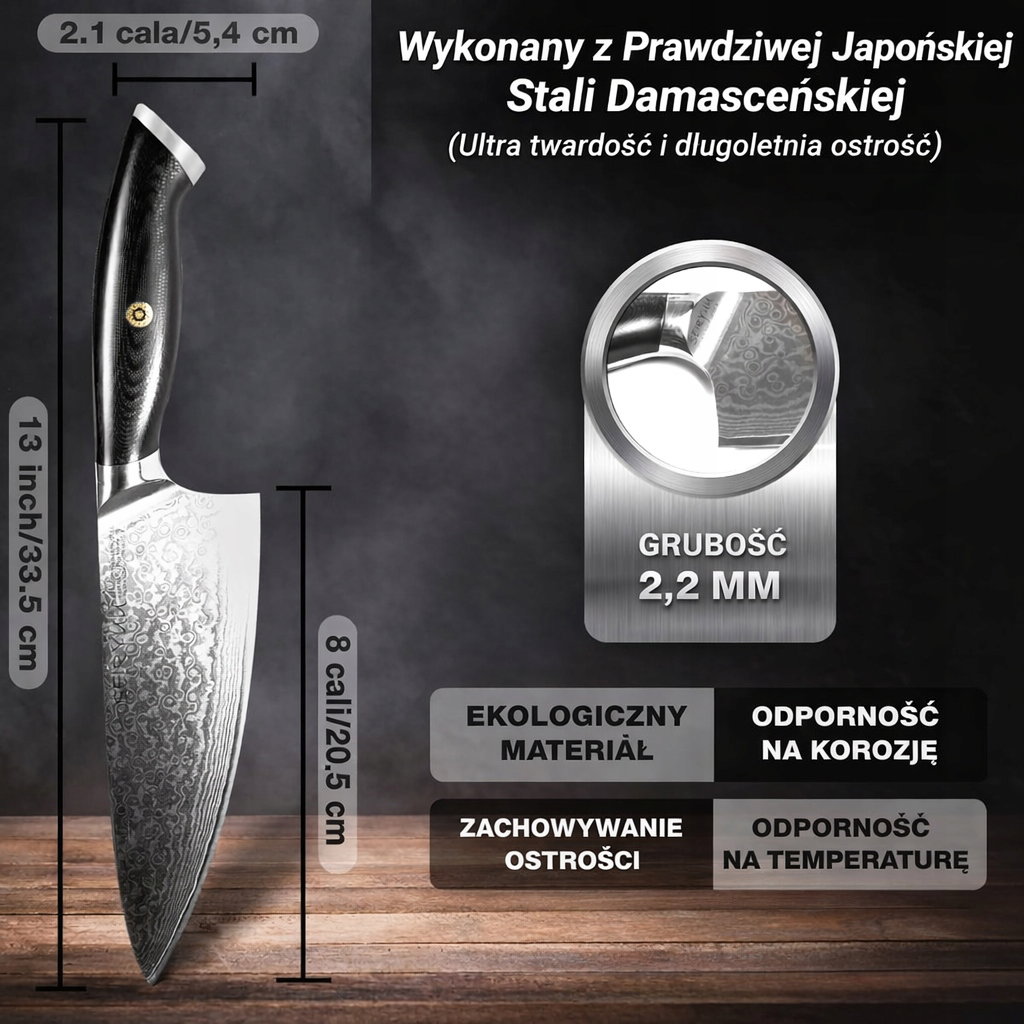 ULTRA OSTRY I WYTRZYMAŁY - materiał ostrza wykonany z 67 warstw stali damasceńskiej, co zapewnia doskonałą ostrość, wysoką odporność na korozję oraz elegancki, charakterystyczny wzór. Rdzeń ostrza 10Cr15CoMov zwiększa jego niezawodność i trwałość.