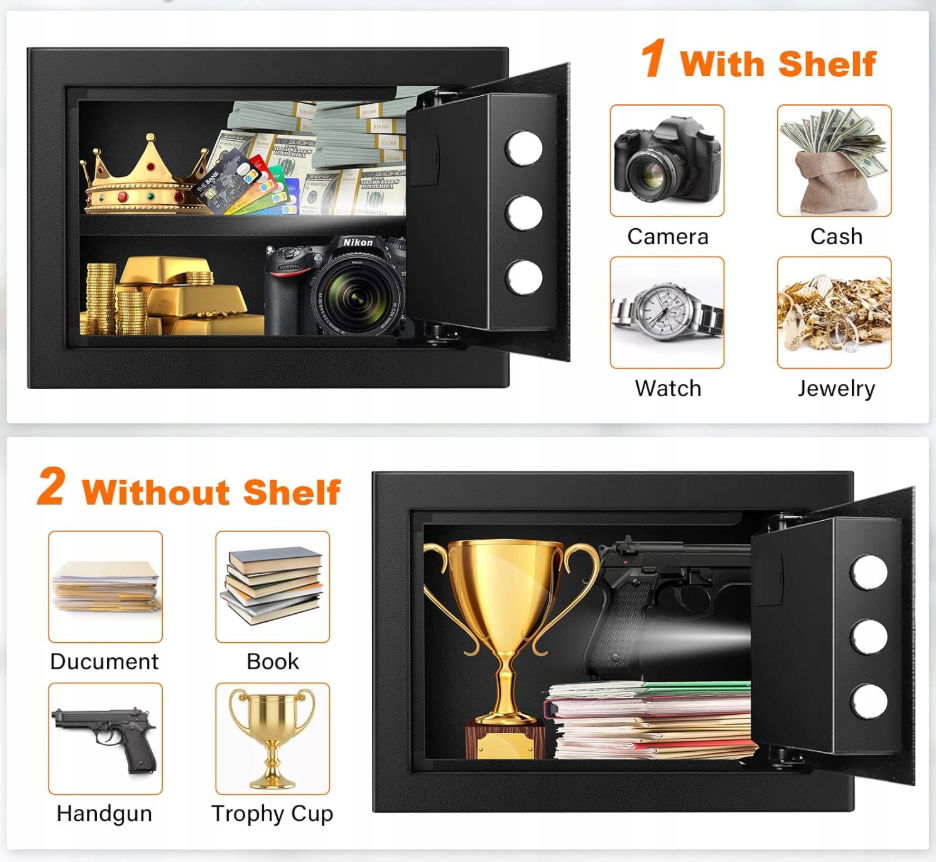 - ✴️3 sposoby otwarcia - możesz użyć kodu numerycznego, aby szybko uzyskać dostęp do wartościowych przedmiotów. Jeśli zapomnisz hasła, możesz otworzyć sejf za pomocą klucza awaryjnego. Lub, gdy bateria jest rozładowana, można użyć pojemnika na baterie awaryjne. Nie musisz się martwić, że zostaniesz wyjęty z Twojego sejfu. Sejf można również przełączyć w tryb wyciszenia, który jest wygodny w różnych sytuacjach