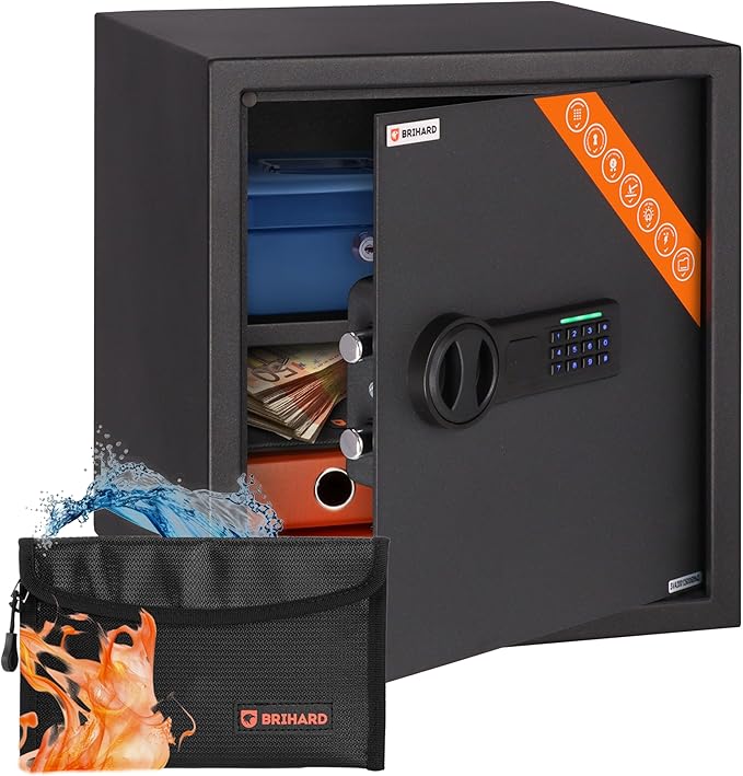 - OGNIOODPORNY NIEZAWODNY SEJF DO DOMU I BIURA: Koniec z obawami przed pożarem - sejf z ognioodporną i wodoodporną torbą na pieniądze może chronić Twoje wartościowe rzeczy przed ogniem i wodą. Duży sejf (48 l) z wewnętrzną wyjmowaną półką dla optymalnej organizacji i wykładziną podłogową do bezpiecznego przechowywania dokumentów w formacie A4, nośników danych, biżuterii lub pieniędzy. Ten elektroniczny sejf to świetny wybór do ochrony Twoich kosztowności