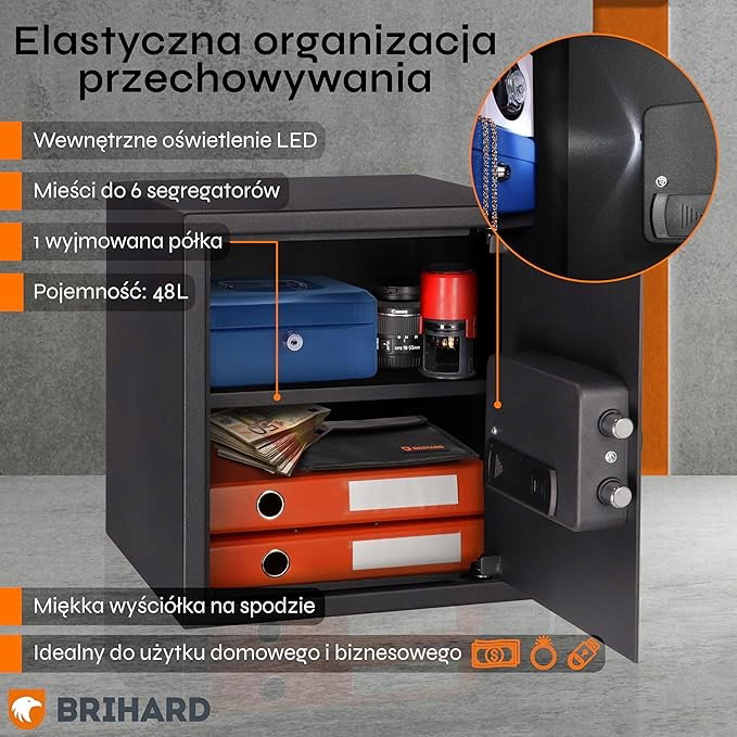 - WYSOKIEJ JAKOŚCI SEJF Z OŚWIETLENIEM WEWNĘTRZYM LED: Doskonała stalowa konstrukcja sejfu, zamek antywłamaniowy z 20-milimetrowymi ryglami blokującymi, ukryte wewnętrzne zawiasy i podwójna rama sprawiają, że nasz elektroniczny sejf jest praktycznie nie do sforsowania. Zintegrowane światło LED pozwala znaleźć poszukiwane przedmioty nawet w ciemności. Wykończenie - proszkowa powłoka koloru czarnej perły, zapewniająca odporność na plamy i zarysowania w porównaniu z innymi rodzajami wykończeń