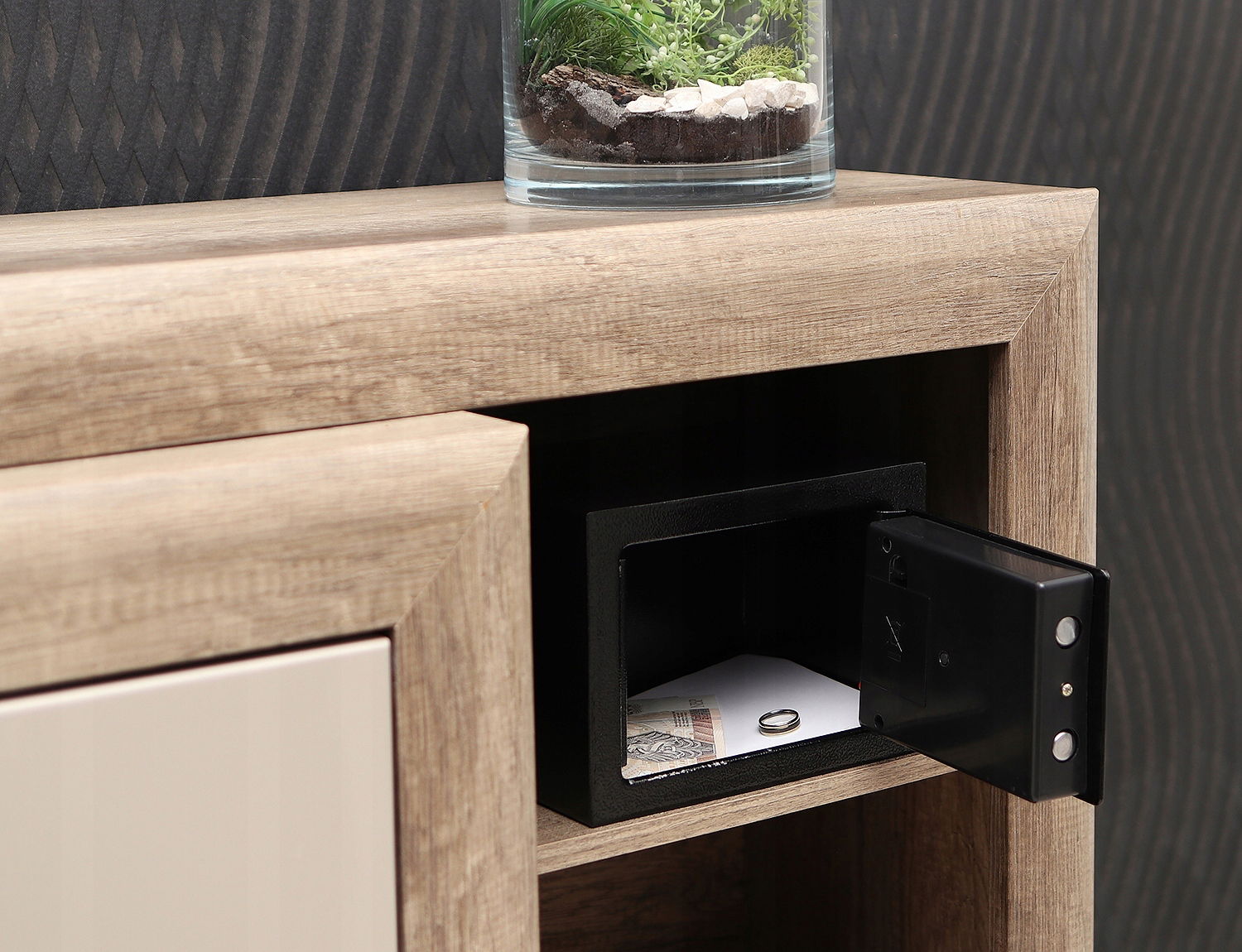 Wymiary przestrzeni wewnątrz sejfu sprawiają, że zmieszczą się w nim arkusze o maksymalnym rozmiarze A5 oraz wszelkiego rodzaju drobne przedmioty o dużej wartości.