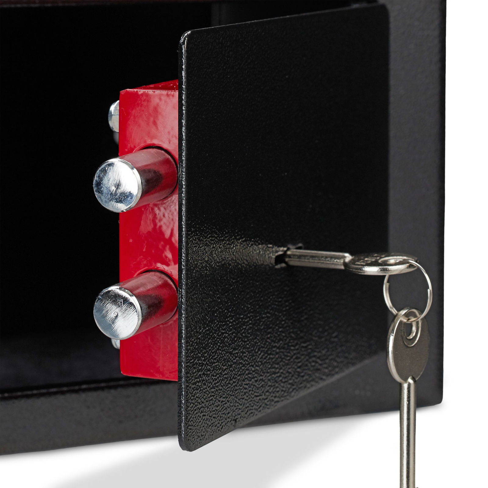 Chroń swoje kosztowności i dokumenty przed kradzieżą. W bezpiecznym mini sejfie można przechowywać pieniądze, biżuterię, paszport i inne ważne dokumenty w formacie A5. Sejf ścienny jest wyposażony w dwupiórowy zamek. Można go zamknąć mechanicznie za pomocą 2 kluczy. W domu najlepiej przechowywać sejf w szafce. Dzięki nawierconym otworom można go przymocować do podłogi lub ściany za pomocą 2 śrub.