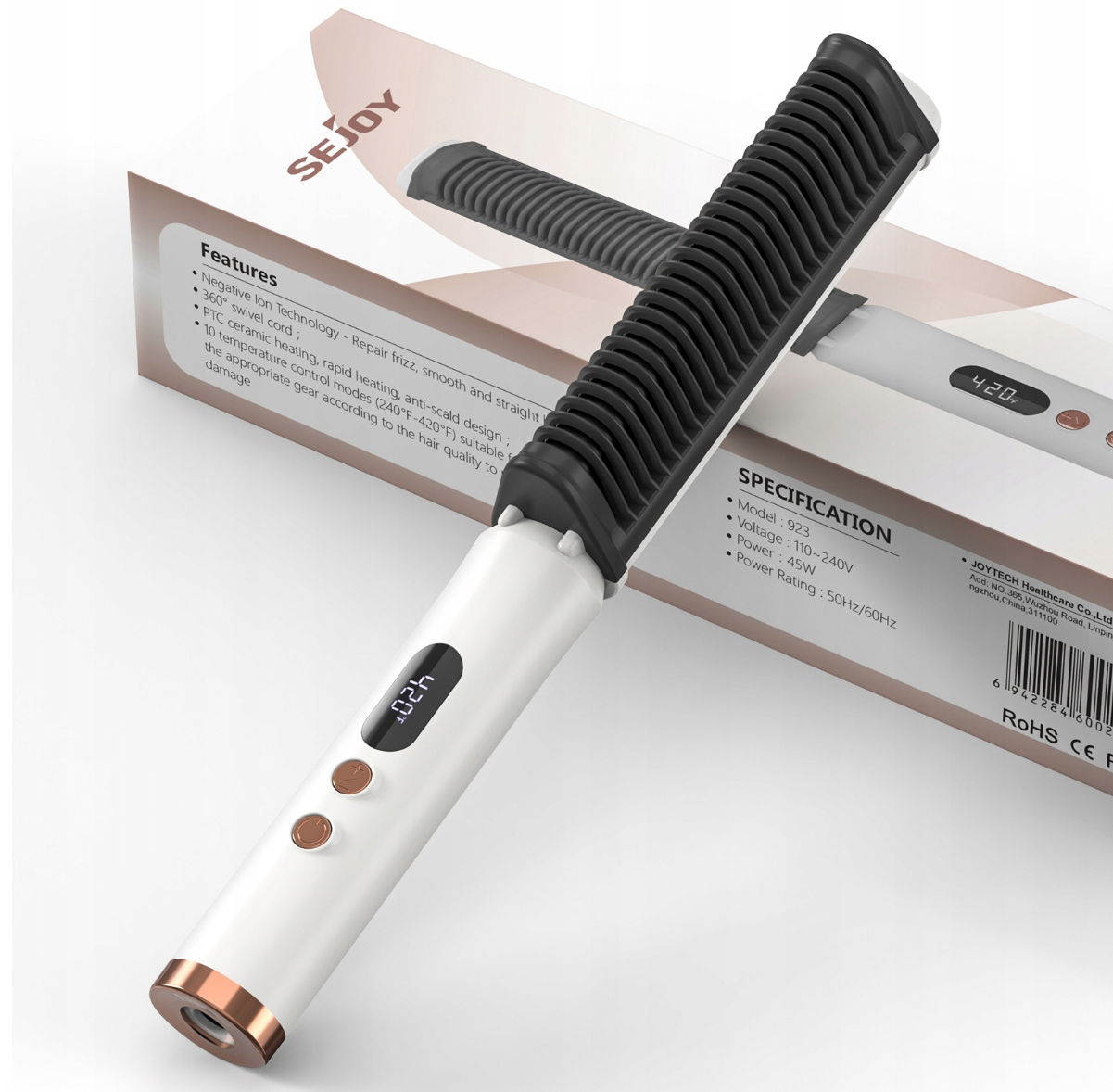 Prostownica i szczotka do włosów Sejoy to urządzenie 2 w 1 do stylizacji włosów, które łączy w sobie funkcje prostego grzebienia i żelazka, aby ograniczyć uszkodzenia spowodowane ciepłem oraz ułatwić i usprawnić stylizację włosów. Przewód obrotowy 360° zapewnia elastyczność stylizacji bez plątania się ani uszkadzania włosów. Nawet jeśli podróżujesz, jest ona na tyle kompaktowa, że możesz ją zabrać ze sobą, dzięki czemu Twoje włosy będą wyglądać fantastycznie w każdej sekundzie.