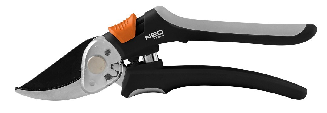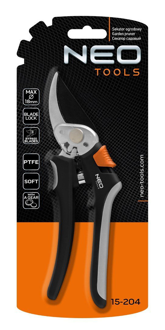 Sekator by-pass, długość całkowita 200 mm, maksymalna średnica cięcia 18 mm, ergonomicznie ukształtowany uchwyt z miękkimi gumowymi uchwytami TPR dla lepszego chwytu i komfortu, łatwa i bezpieczna blokada kciukiem dla prawej i lewej ręki, przekładnia znacznie ułatwia cięcie, ostrza z wysokiej jakości hartowanej stali, ostrza z powłoką nieprzywierającą, ostrze do świeżego drewna,