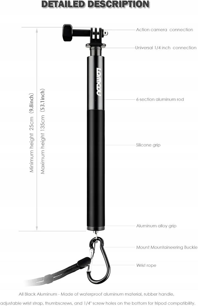 - ✔ Idealny towarzysz w podróży: drążek do selfie Action Cam to długi drążek przedłużający z aluminium, który wysuwa się do 135 cm, co umożliwia nowe perspektywy i przybliża kamerę do akcji. Idealnie nadaje się do nagrywania filmów o sportach ekstremalnych, takich jak deskorolka, surfing, skoki spadochronowe, jazda na nartach i wiele innych.