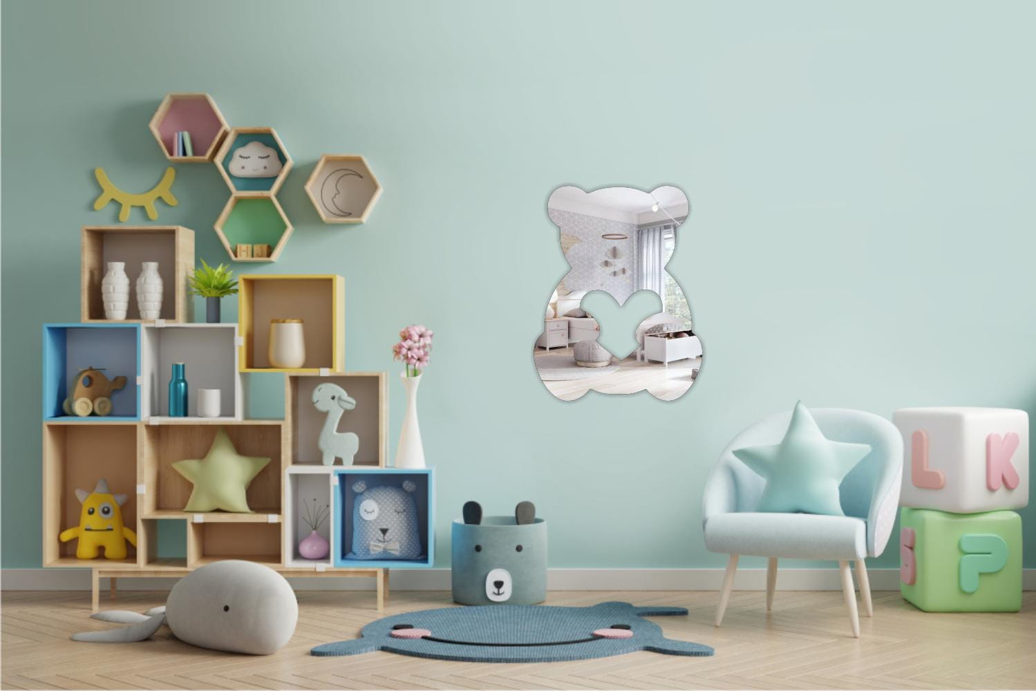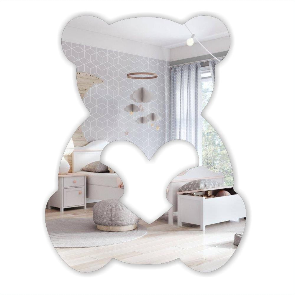 Sercowy Miś to dekoracyjne lustro akrylowe w kształcie sympatycznego misia z sercem — elegancka i bezpieczna ozdoba ścienna dostępna w dwóch rozmiarach i w wersji srebrnej lub złotej.