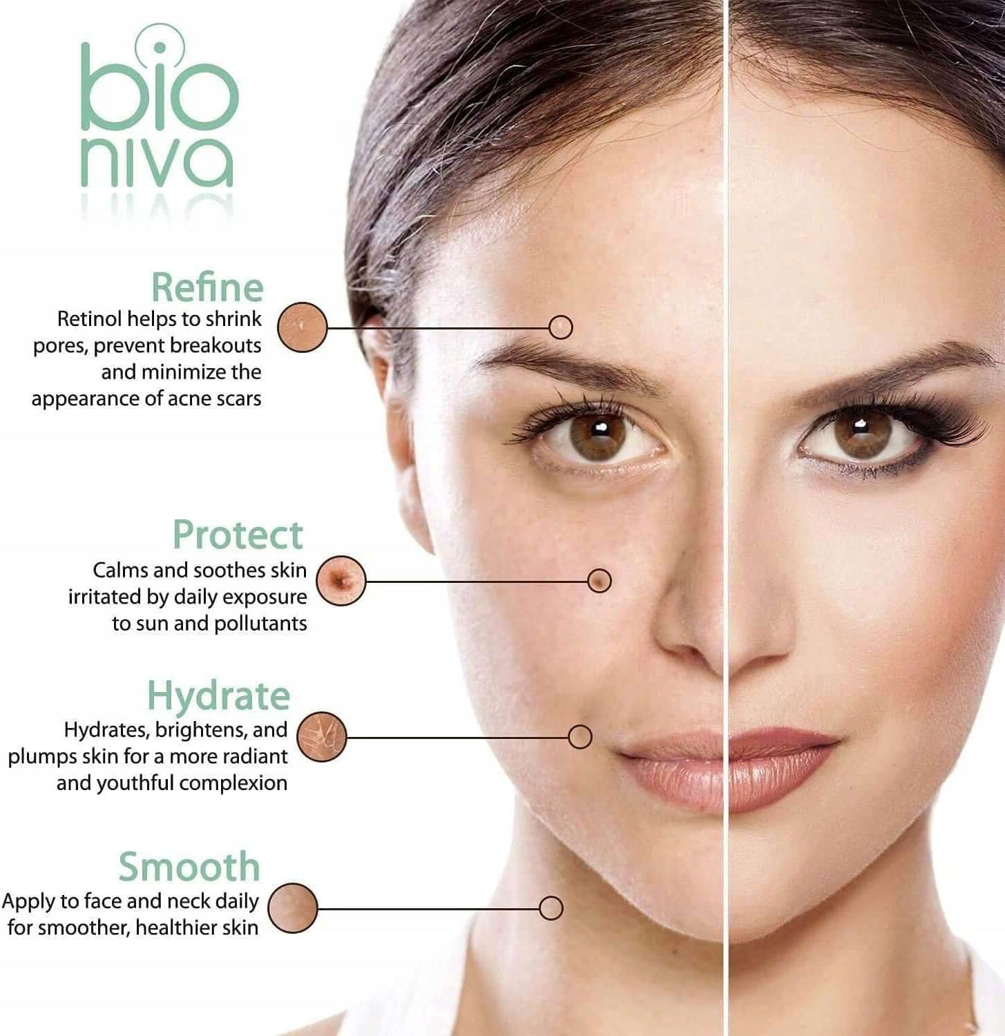 Retinol pomaga łagodzić uszkodzenia skóry, poprawia nierównomierne odcienie skóry i jest szczególnie skuteczny przy udoskonalaniu porów i walce z drobnymi liniami i zmarszczkami.